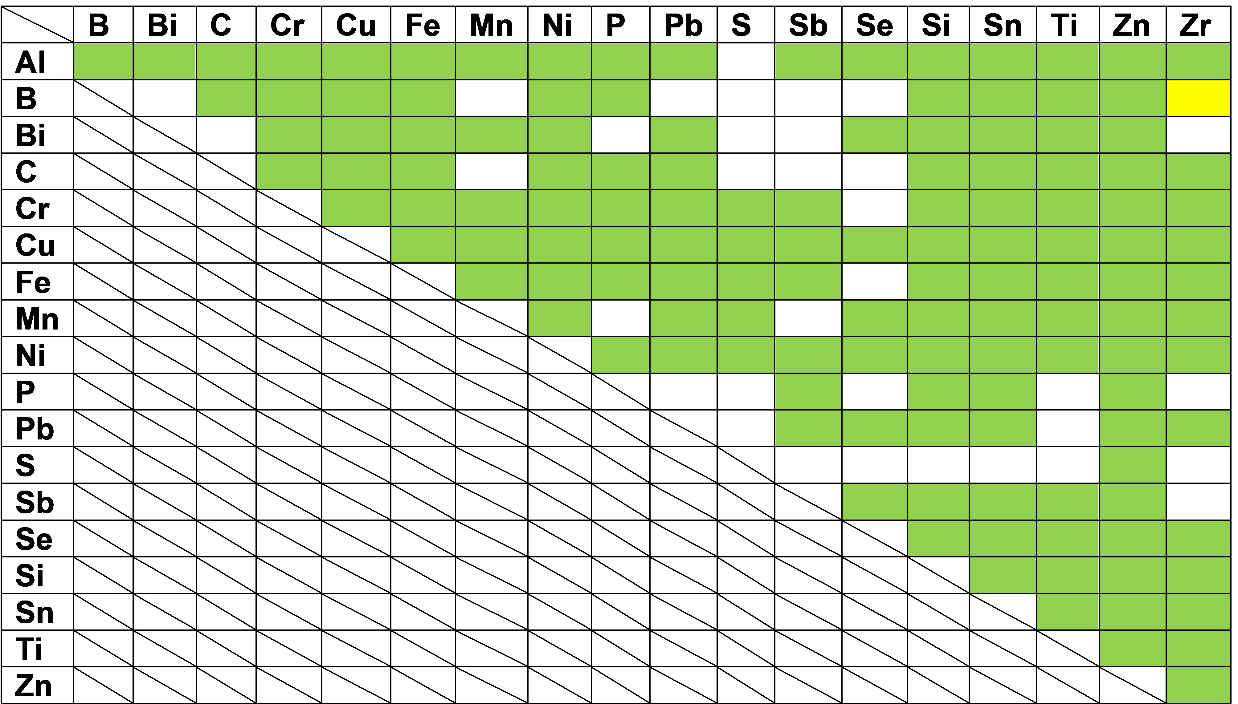 The suggested composition range for each element is listed in Table 1.1. It should be noted that this given composition range is rather conservative. It is derived from the chemistries of the multicomponent commercial alloys that have been used to validate the current database. In the subsystems, many of these elements can be applied to a much wider composition range. In fact, some subsystems are valid in the entire composition range as given in Section Key Elements and Subsystems.