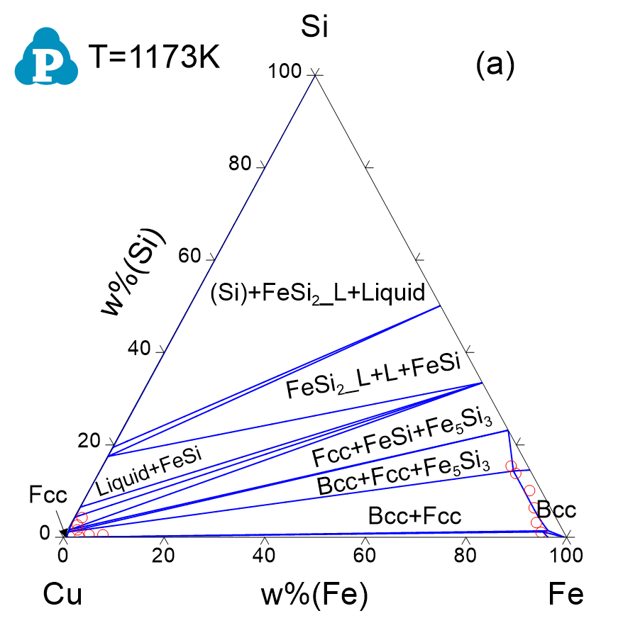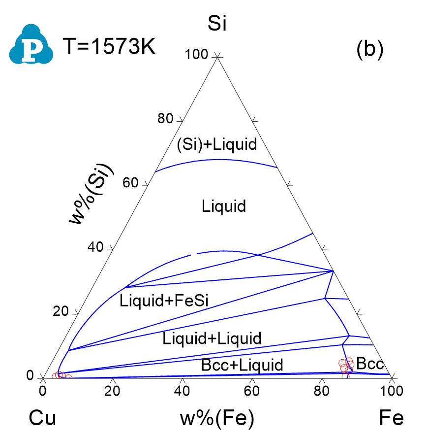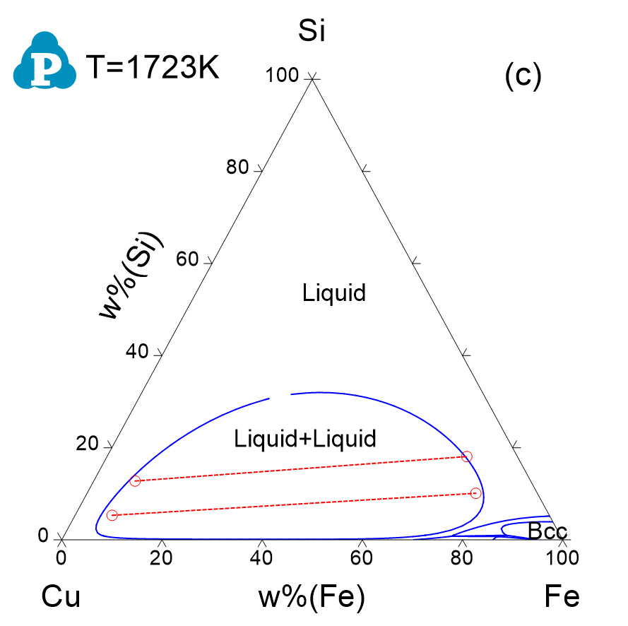 Figure 1.2: Calculated isothermal section diagrams of the Fe-Cu-Si system at (a) 1173K, (b) 1573K, and (c) 1723K with the experimental data [1997Oht, 1999Him, 2002Wan]