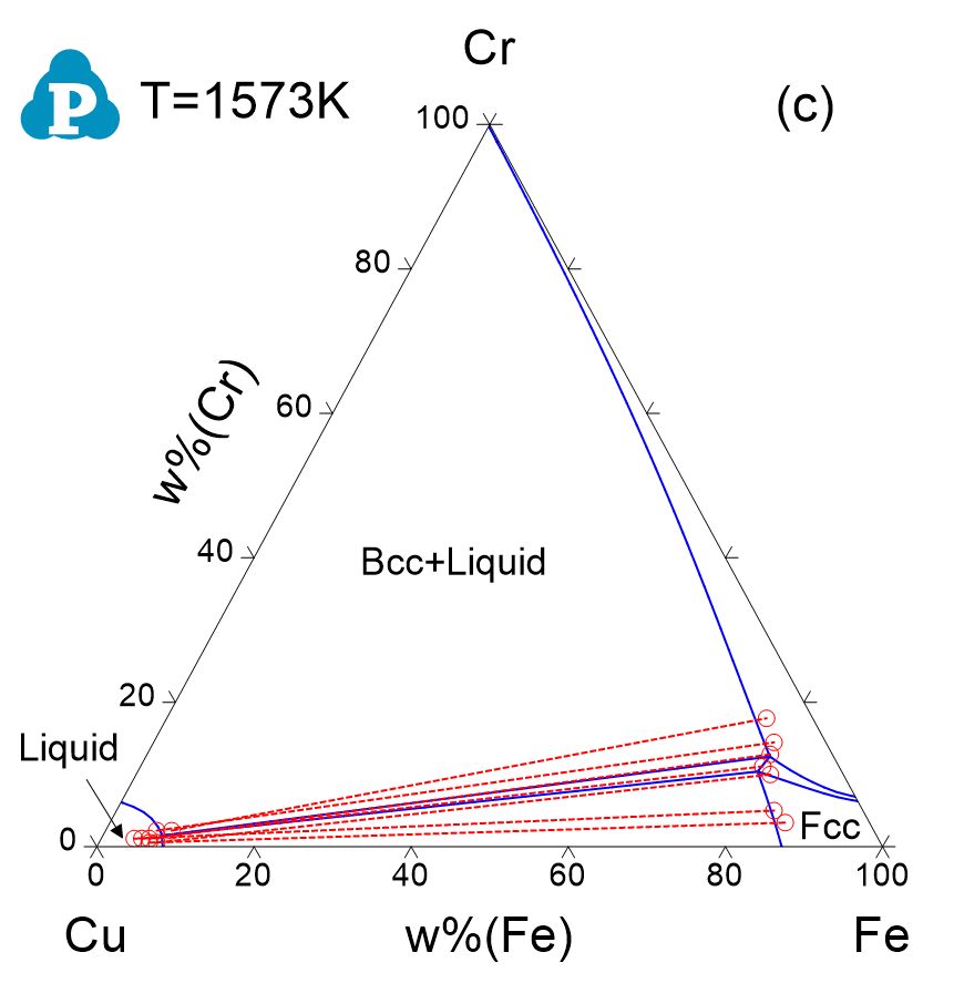 Figure 1.1: Calculated isothermal section diagrams of the Fe-Cu-Cr system at (a) 1273K, (b) 1373K, and (c) 1573K with the experimental data [1997Oht, 2002Wan]