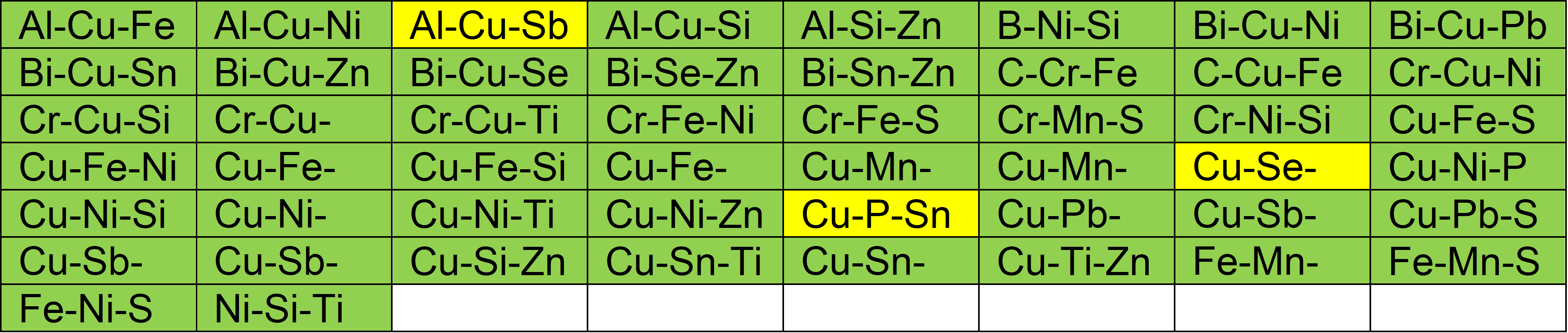 Key elements of the system are listed as: Cu-Cr-Fe-Mn-Ni-Pb-Si-Sn-Zn. The modeling status for all the constituent binaries and key ternaries are given in The color represents the following meaning:
