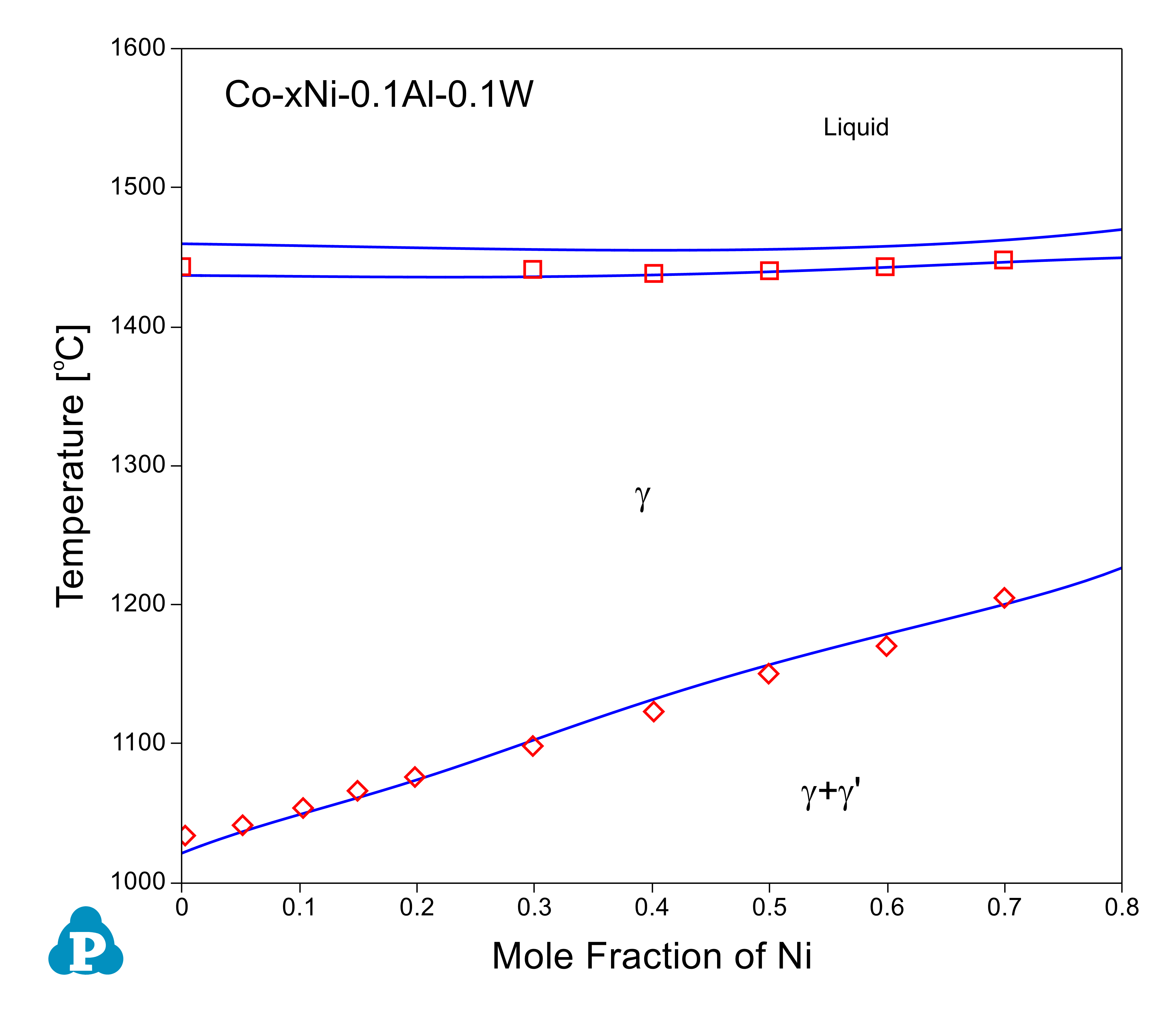 The current thermodynamic database for cobalt alloys has been extensively tested and validated using the published experimental data [2008Ish, 2008Shi, 2010Bau, 2010Pol, 2012Bau, 2015Mak, 2015Mak2]. Figure 1.1 and Figure 1.2 show two calculated isopleth in the Co-Al-Ni-W quaternary system compared with the experimental data [2008Ish, 2008Shi]. The isopleth in Figure 1.1 is a vertical section at 10 at% of Al and 7.5 at% of W and that in Figure 1.2 is at 10 at.% of Al and 10 at.% of W. In both figures, the calculated phase boundaries are in good agreement with the experimental data. Makineni et al. [2015Mak, 2015Mak2] discovered a new class of γ/γ' Co-based superalloy that is free of tungsten, with the composition of Co-10Al-5Mo-2Nb (in at.%). The solvus temperature can be further enhanced by addition of Ni to form Co-xNi-10Al-5Mo-2Nb, where x can be from 0 to 30 at.%. The comparison between the calculated and measured γ' solvus is shown in Figure 1.3. Figure 1.4 and Figure 1.5 show two calculated isothermal sections with fixed Ni content at 60 at% for the Co-Ni-Al-Cr quaternary system at 1100 °C and 1000 °C, respectively. The calculated results agree well with the experimental observations from annealed alloy samples [2006Bur]. Figure 1.6 shows the comparison between the calculated liquidus, solidus and γ' solvus temperatures and the experimentally measured ones [2010Bau, 2010Pol, 2012Bau].