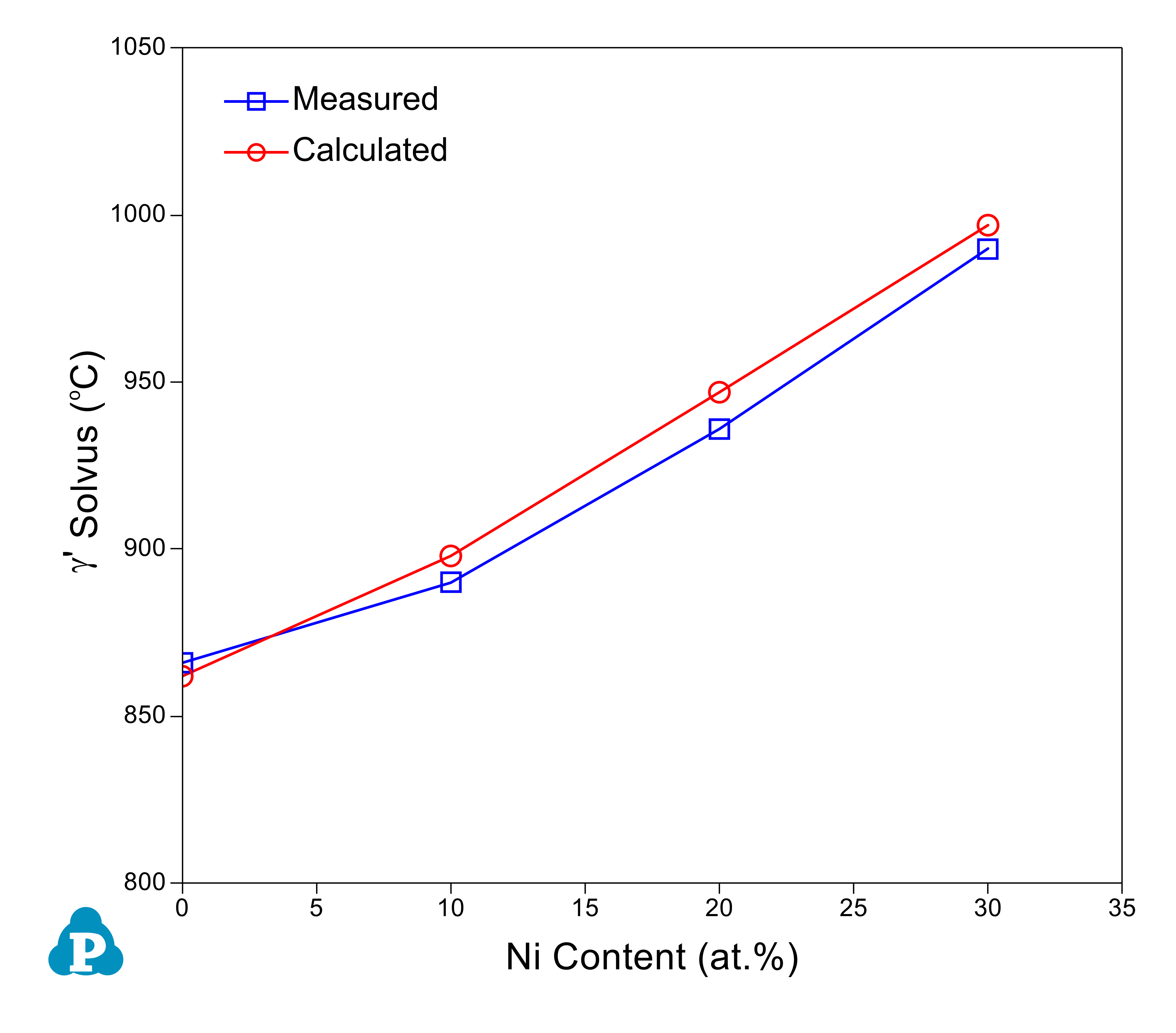 Figure 1.3: Comparison between the calculated and measured γ' solvus for Co-xNi-10Al-5Mo-2Nb alloys