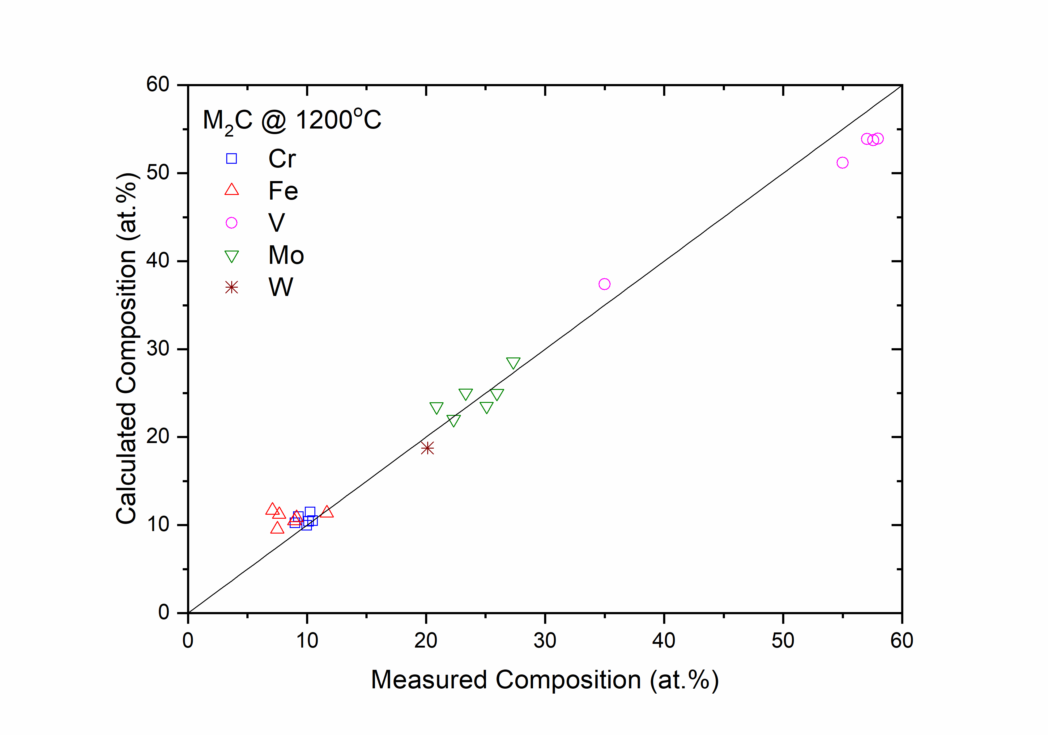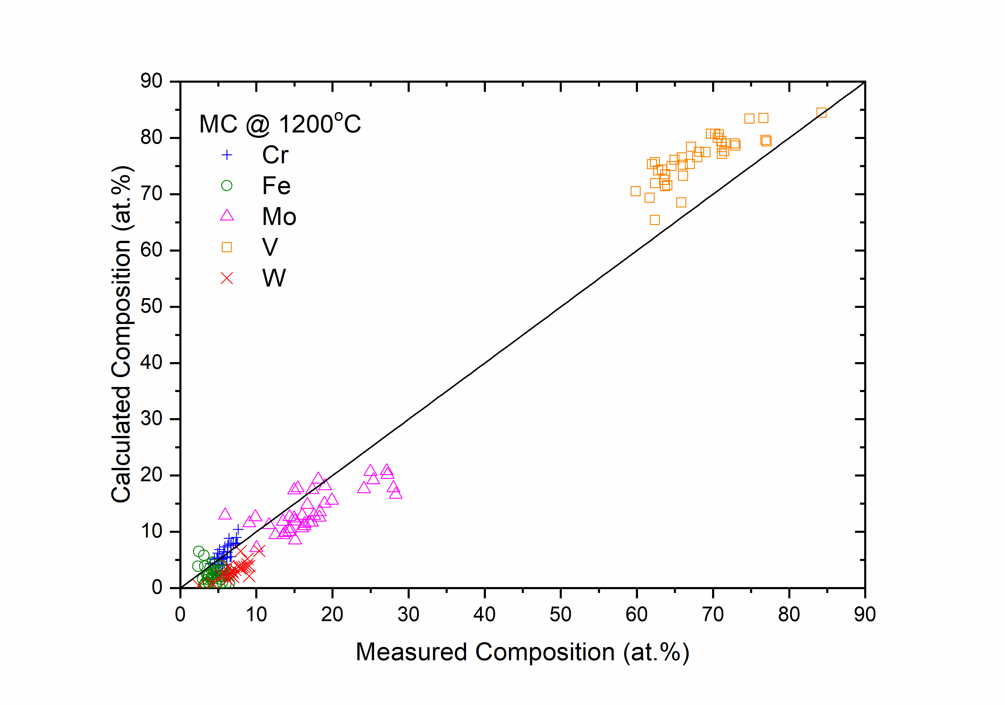 Figure 1.8: Comparison between the calculated and measured equilibrium compositions of Cr, Fe, Mo, V and W in the MC phase at 1200 °C