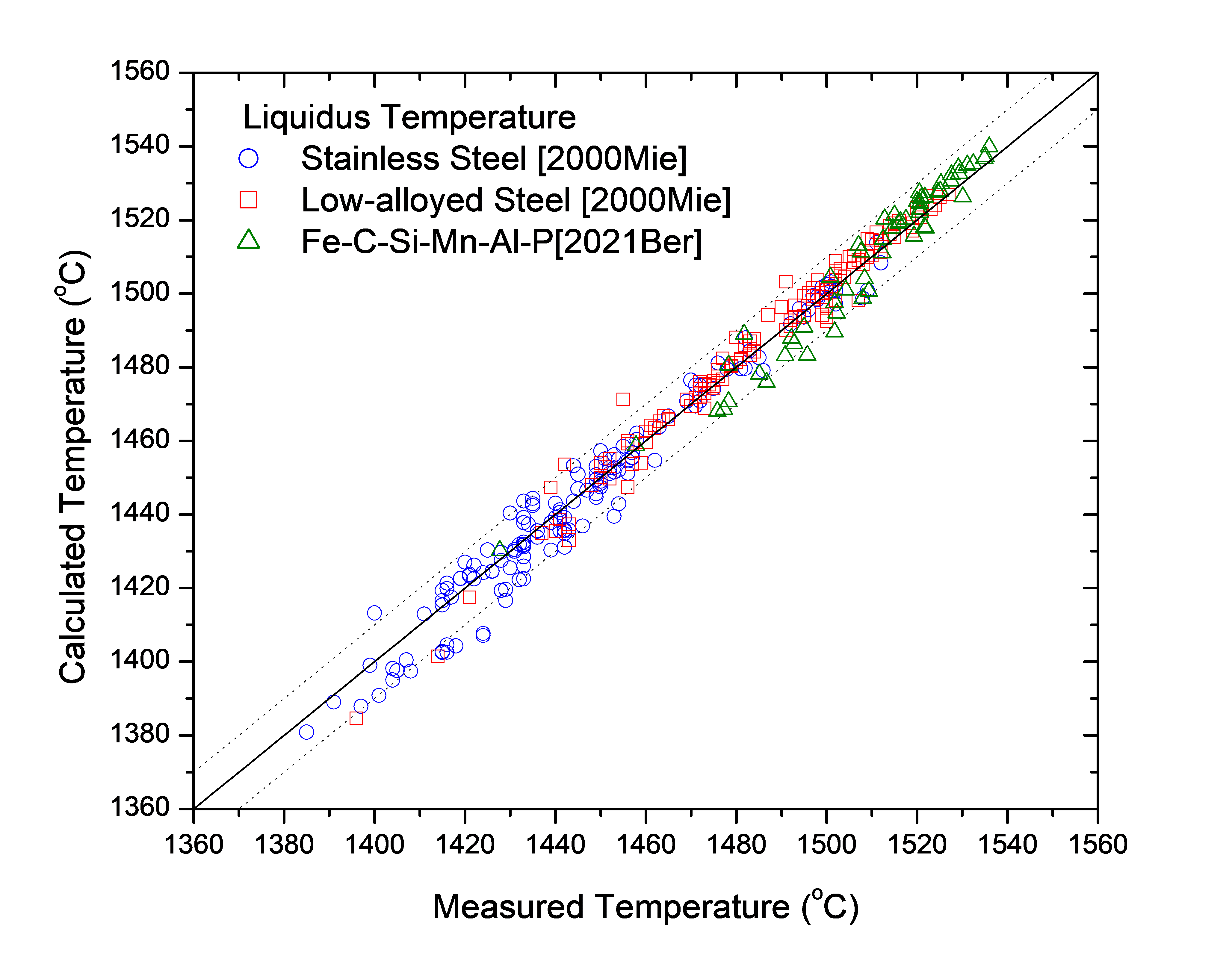 Figure 1.2: Comparison between the calculated liquidus temperatures for iron-based alloys with experimental data from [2000Mie,2021Ber]