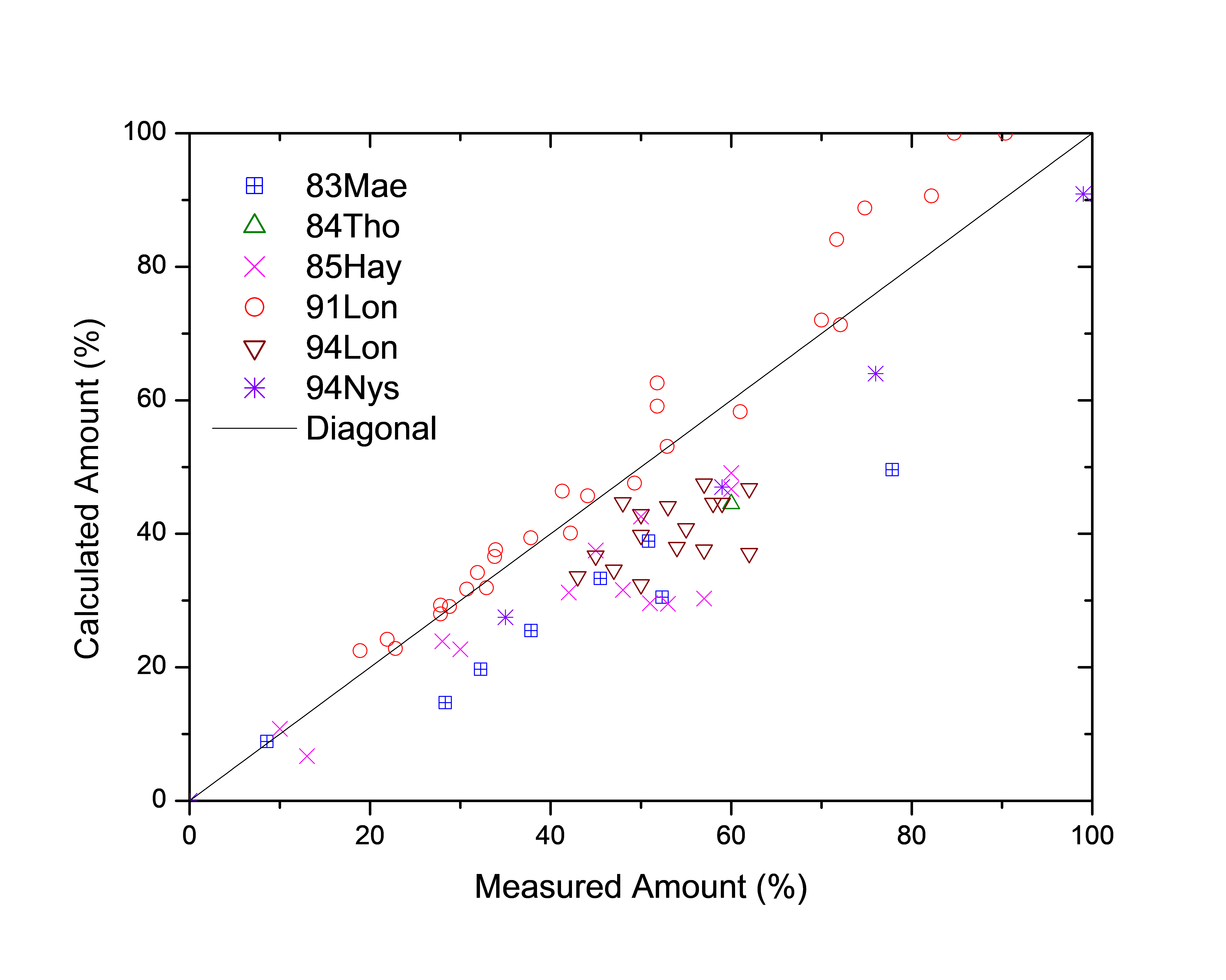 Figure 1.3: Comparison between the calculated and experimentally measured amounts of austenite in duplex stainless steels of austenite (Fcc)