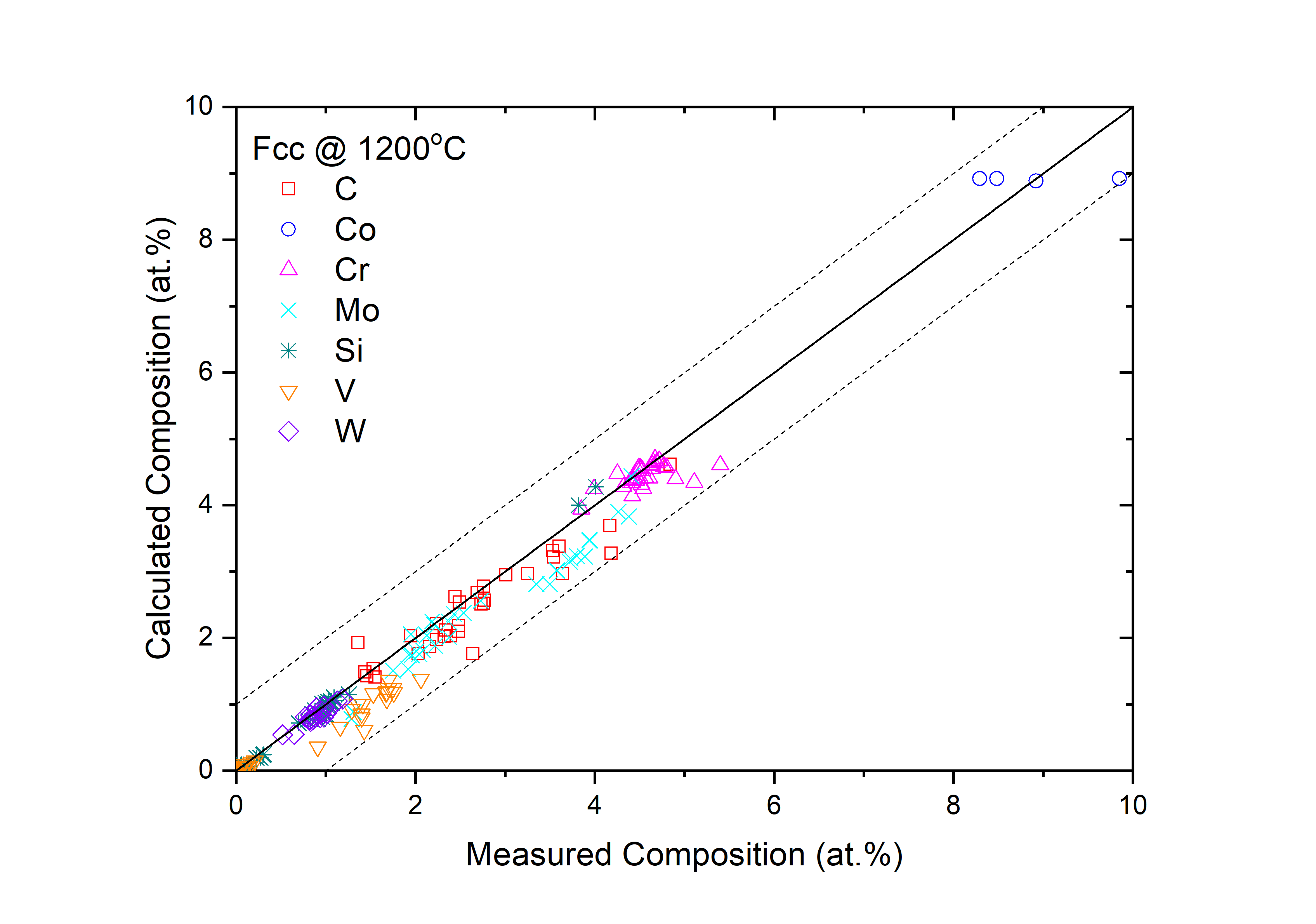 Figure 1.5: Comparison between the calculated and measured equilibrium compositions of C, Co, Cr, Mo, Si, V and W in the Fcc phase at 1200 °C
