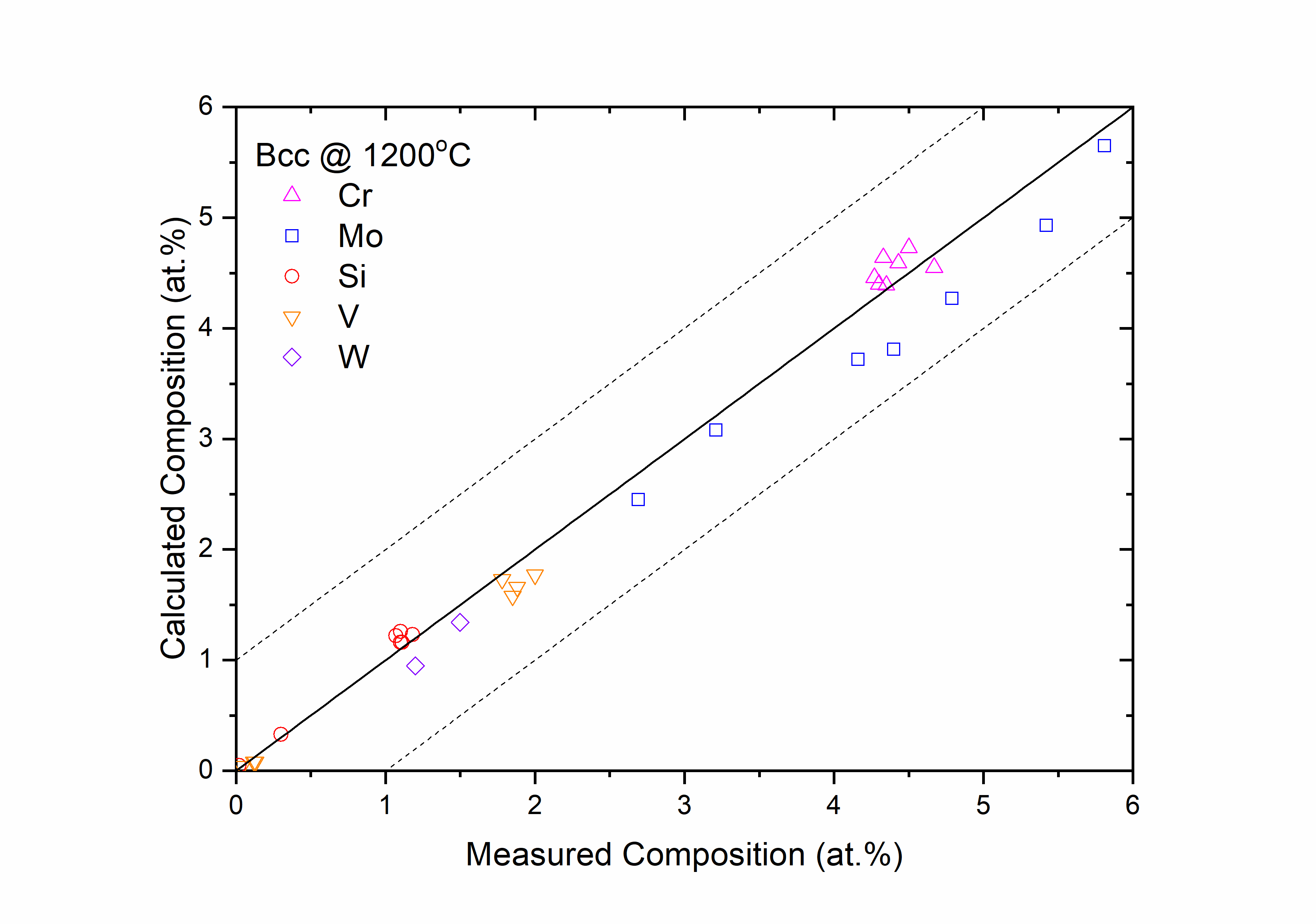 Figure 1.6: Comparison between the calculated and measured equilibrium compositions of Cr, Mo, Si, V and W in the Bcc (ferrite) phase at 1200 °C