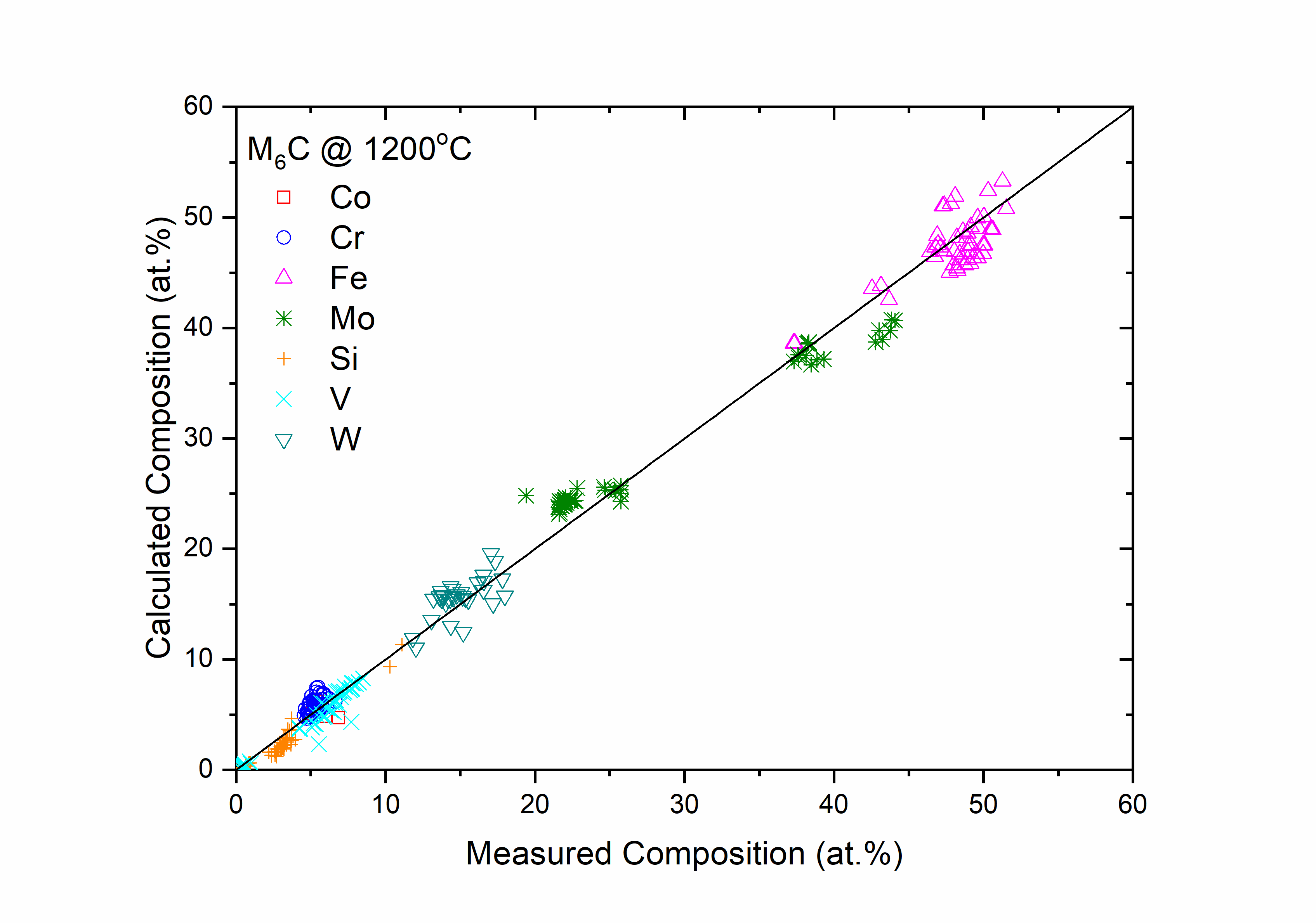 Figure 1.7: Comparison between the calculated and measured equilibrium compositions of Cr, Mo, Fe, V and W in the M6C phase at 1200 °C