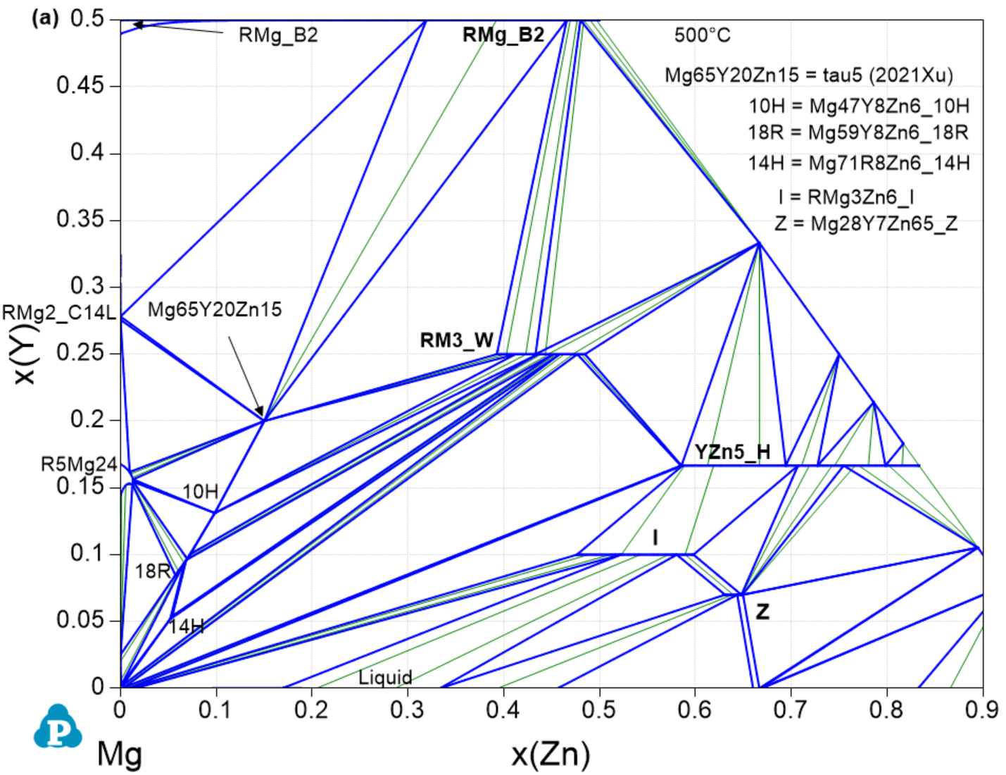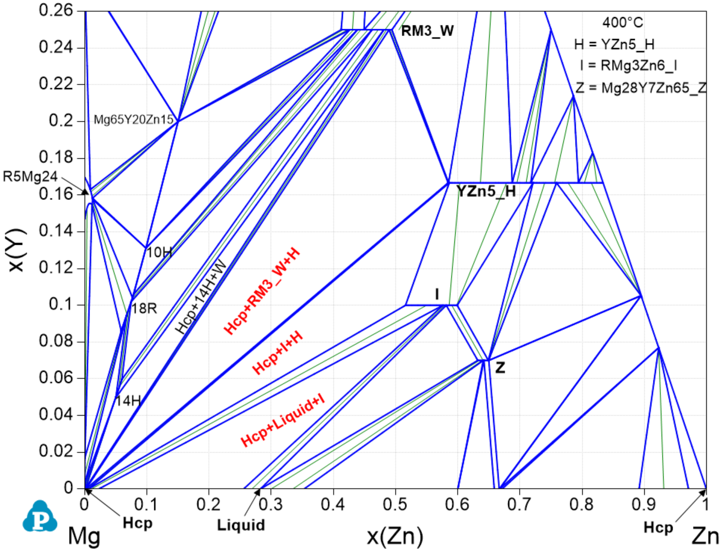 At 400°C the equilibria (Mg)+Liquid+I, as opposed to (Mg)+Liquid+Z, as well as (Mg)+I+H and (Mg)+RM3_W, confirmed by TEM [2020Liu], are exactly represented in the Mg-Y-Zn isothermal section of Figure 1.10 calculated with PanMg. None of the currently published alternative CALPHAD descriptions, e.g. [2021Xu1, 2023Rua], is capable of describing the entity of experimentally verified data of the Mg-Y-Zn system as shown by PanMg.