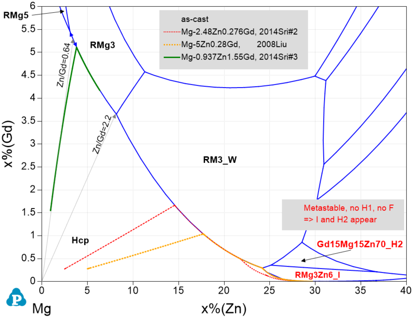 The Mg-Gd-Zn system includes the solid-solution LPSO phase 14H and the re-optimization is validated by the experimental data of the entire stable phase equilibria [2012Qi, 2015Gro] as well as the intricate metastable phases I and H2 [2016Gro]. The experimental fact that after heat treatment at 400 or 500°C, the I and the H2 phases, observed in cast alloys, transform into the stable phases F and H1 [2016Gro] are reflected in the Mg-Gd-Zn isothermal sections at 400 and 500°C for the stable system and the metastable system with suspended phases F and H1, calculated with PanMg2024. In addition, the more recent experimental data [2023Xu, 2021Xu2, 2021Liu] were considered but found less conclusive. The as-cast formation conditions of the icosahedral I phase, modeled as RMg3Zn6_I with R = (Y,Gd) solubility, is detailed in the calculated Mg-Gd-Zn liquidus projections for the stable system, Figure 1.11, and the metastable system, Figure 1.12, where only a small supercooling leads to the crystallization fields of I and H2 phases. These data are, in addition to [2016Gro], validated by the experimental studies of as-cast [2008Liu, 2014Sri, 2016Li, 2018Luo] and directionally solidified [2017Yan] alloys. As example, the Scheil-simulated solidification paths superimposed on Figure 1.12 for the two alloys with high Zn/Gd ratio [2014Sri#2, 2008Liu] demonstrate after primary (Mg) the secondary phases RM3_W and RMg3Zn6_I as also observed experimentally. By contrast, the alloy with low Zn/Gd ratio [2014Sri#3] show after primary (Mg) only the secondary phase RMg3 (with 23 at.% Zn) at the Scheil-solidus of 555°C. For that alloy the equilibrium calculation indicates the formation of 14H in the reaction RMg3 + (Mg) = 14H at about 536°C. That is well verified by the observed microstructure where the small fraction of LPSO phase next to RMg3 in alloy #3 was assumed to be formed due to the relatively slow cooling rate [2014Sri].