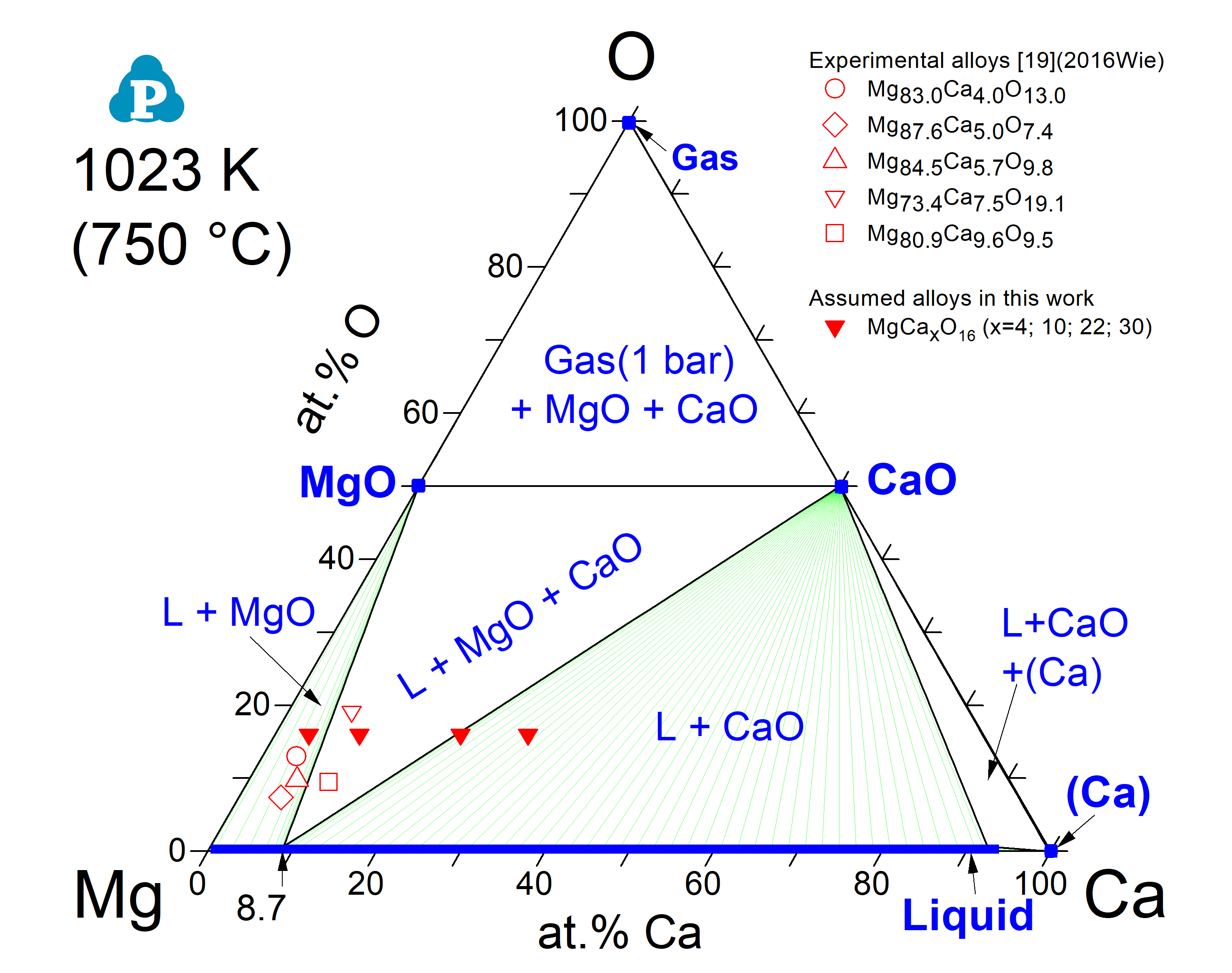 Another highlight of PanMg is the incorporation of oxygen as an element and all relevant solid oxides and gas species. For example, the reaction of Mg with CaO during melting and solidification was studied experimentally and the thermodynamic description of the Mg-Ca-O system was developed with scrutinized oxide data. The calculated isothermal section in Figure 1.13 is also validated using in-situ synchrotron radiation diffraction [2018Lia1, 2018Lia2].