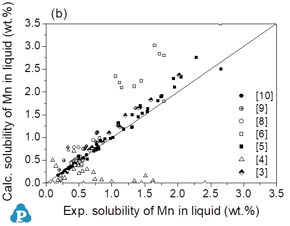 Figure 1.3: Comparison between calculated results and experimental data for all alloy samples in the Mg-Al-Mn system. (a) Liquidus temperature at a given composition, (b) Solubility of Mn in liquid at a given temperature and Al composition. The straight line in Figs. (a) and (b) is a visual aid corresponding to perfect agreement between experimental values and the calculated results from the present thermodynamic model