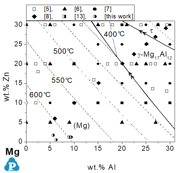 [1998Lia] Liang, P., Tarfa, T., Robinson, J.A., Wagner, S., Ochin, P., Harmelin, M.G., Seifert, H.J., Lukas, H.L., Aldinger, F., Experimental investigation and thermodynamic calculation of the Al-Mg-Zn system, Thermochim. Acta, 314 (1998): 87-110.