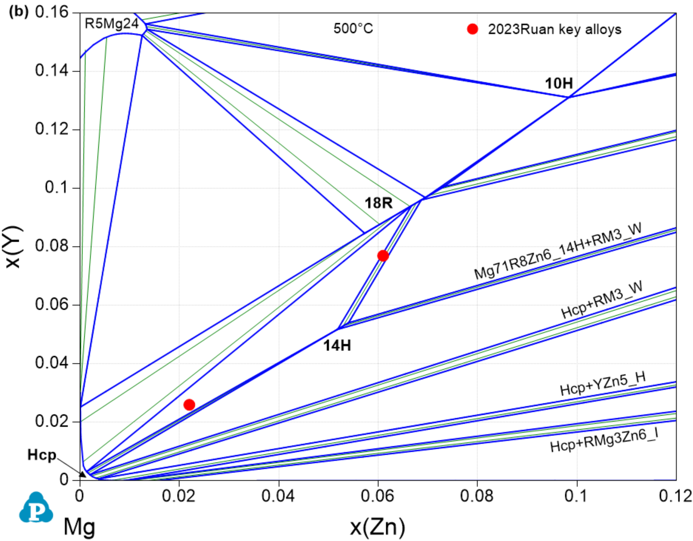 That is exemplified for Mg-Y-Zn in the calculated isothermal sections at 500°C shown for Mg-rich corner in Figure 1.9. The detail in Figure 1.9b shows the perfect agreement with the dedicated TEM study of the two key alloys of [2023Rua] in the 14H+18R two-phase and (Mg)+14H+18R three-phase regions. This also reflects the experimentally verified solid solution ranges of these two LPSO phases 14H and 18R in the TEM studies [2021Rua1, 2021Rua2], confirmed by the experimental data indicated in [2015Sch2], that were simplified to stoichiometric phases at that time in PanMg2015 and the previous study [2012Gro]. The phase equilibria at lower Mg-content in Figure 1.9a are also confirmed by the mutually consistent experimental data assessed from [2012Gro, 2015Sch2, 2021Xu1] and include the new compound Mg65Y10Zn15 [2021Xu1].