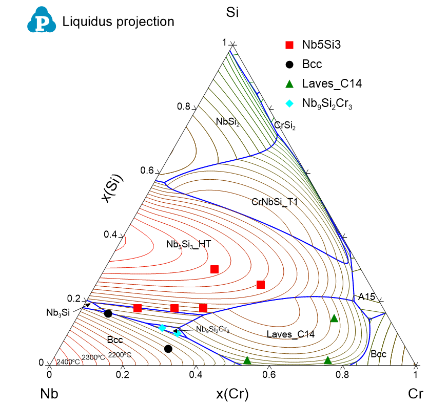 Figure 1.4 shows the calculated liquidus projection of Nb-Cr-Si overlaid by experimental data. Again, the different symbol of experimental data [2007Bew] denotes that the primary solidification phase observed in the as-cast microstructure of the alloy. Figure 1.5 shows the calculated isothermal section of Nb-Cr-Si at 1100 °C. In PanNb, a ternary phase Nb9Si2Cr3, was included in the thermodynamic description of the Nb-Cr-Si system for the first time.