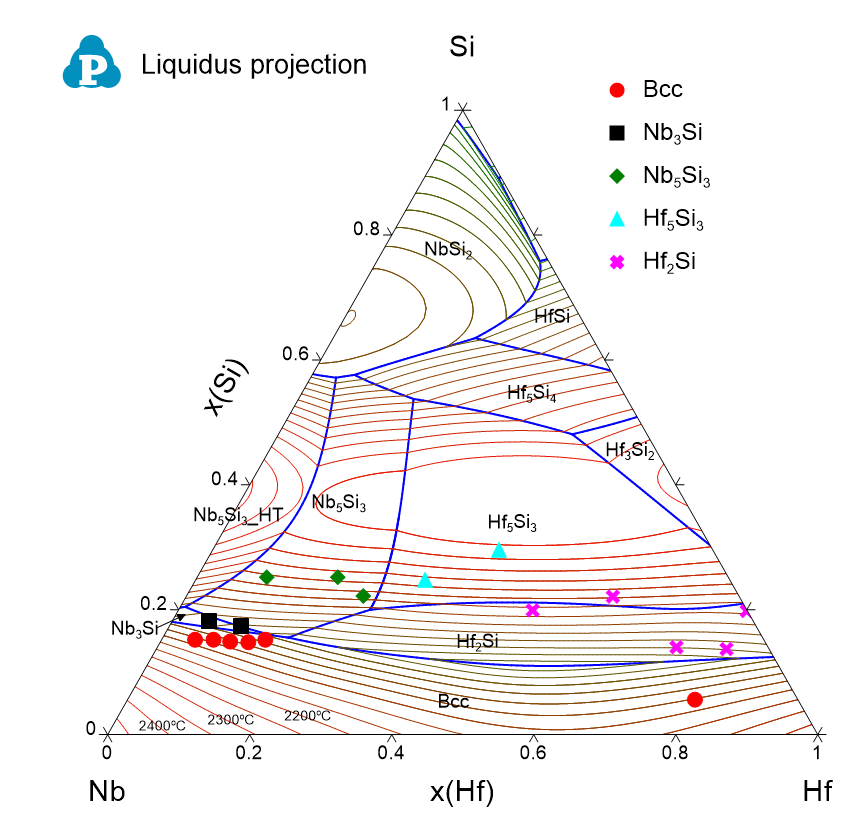 Figure 1.6: Calculated liquidus projection of Nb-Hf-Si together with experimental data [1999Bew, 2003Yan]
