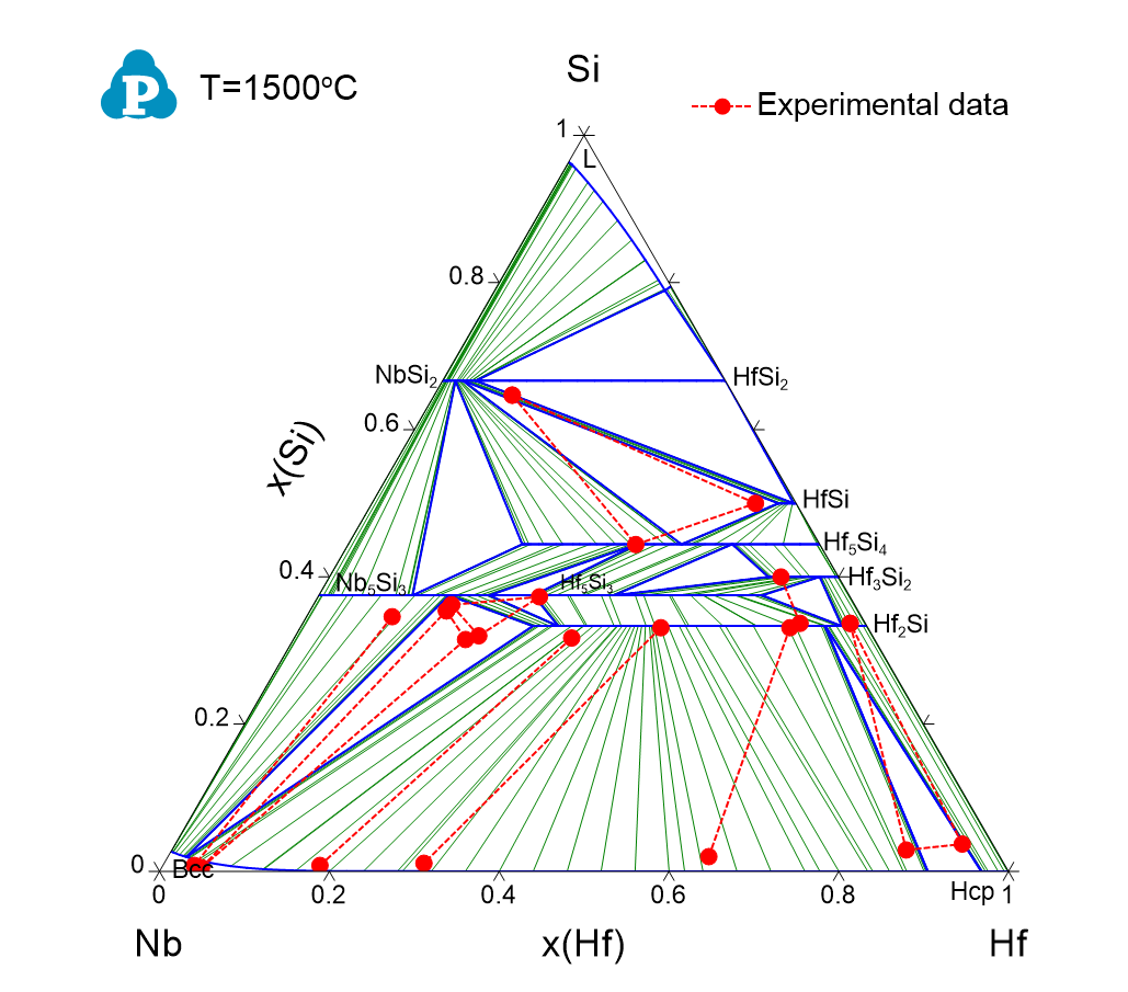 Figure 1.7: Calculated isothermal section of Nb-Hf-Si at 1500 °C together with experimental data [2001Zha]