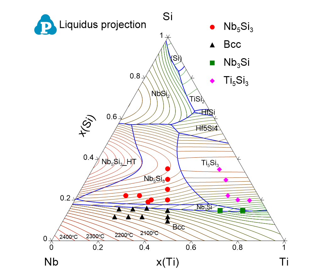 The current PanNb database was validated by large amounts of phase equilibrium data available for Nb alloys. A few examples are given here. Figure 1.1 shows the calculated liquidus projection of the Nb-Ti-Si system together with the experimental data [1997Bew]. The different symbol of experimental data denotes that the primary solidification phase observed in the as-cast microstructure of the alloy. The two invariant reactions at the metal-rich region of Nb-Ti-Si are L+Nb5Si3 →Ti5Si3+Nb3Si at 1599 °C and L+Nb3Si → Ti5Si3+Bcc at 1359 °C.