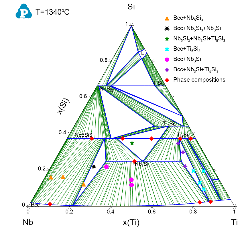 Figure 1.2 and Figure 1.3 show the calculated isothermal section of Nb-Ti-Si at 1500 °C and 1340 °C, respectively. The experimental data are also plotted for comparison. The phase compositions are from EPMA measurements. The detail of experiments can be found in literature [1998Bew]. Different shapes of the symbols denote the different phase regions where the alloys are located. The green lines are tie lines.