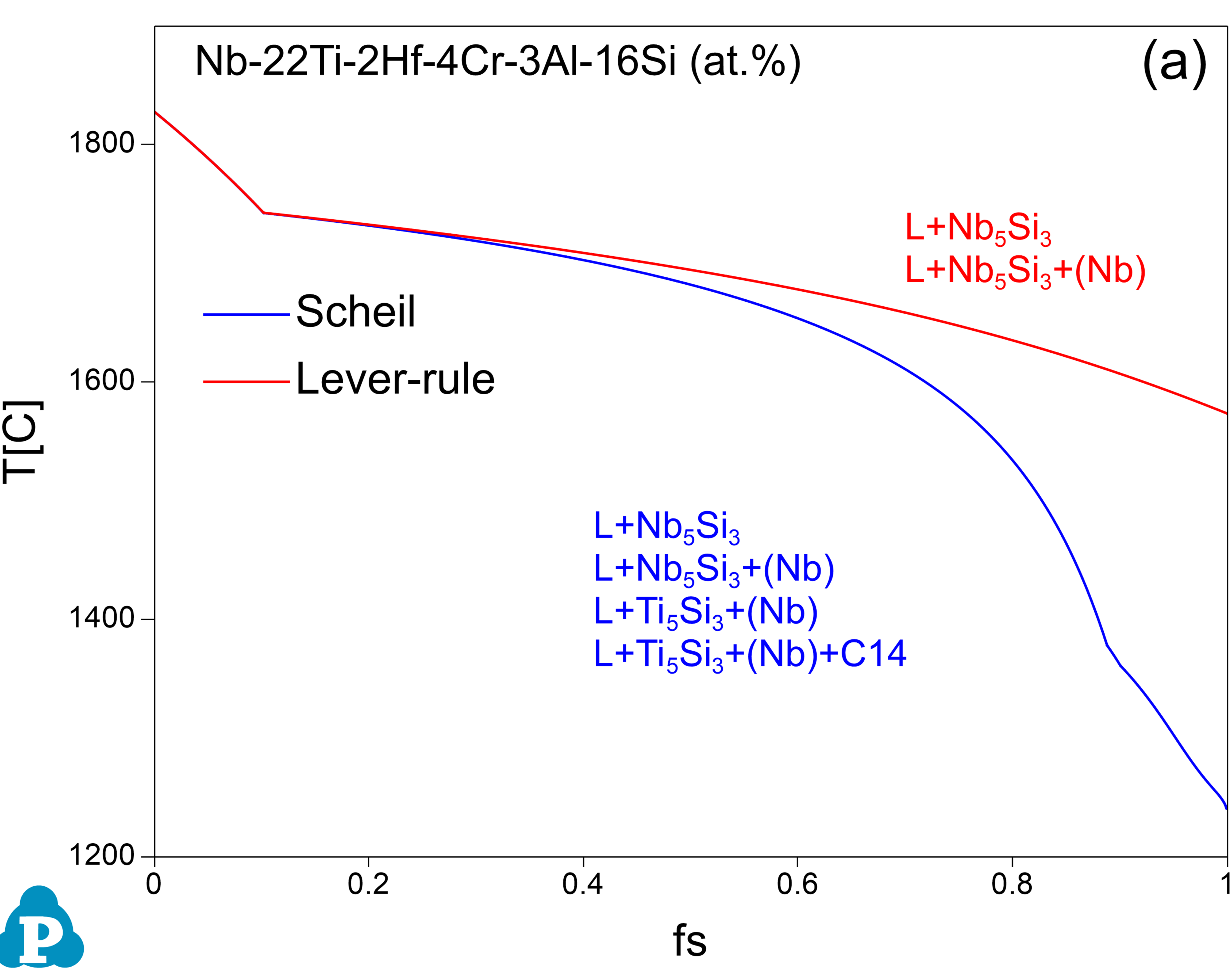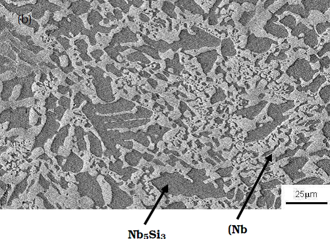 Figure 1.8(a)-(b) show the simulated solidification paths for the Nb-11Cr-23Ti-13Si, and Nb-21Cr-23.5Ti-15.5Si alloys. The BSE images of the as-cast microstructures of these two alloys are shown in Figure 1.8(c)-(d), respectively. The phase observed in the BSE images is well predicted by the lever-rule simulation and the early stage of the Scheil simulation. The additional phases predicted by the Scheil model were not identified in the BSE images, which maybe either due to the small amount presented in the microstructure or the micro-segregation in real cooling condition is not as severe as assumed by Scheil simulation. Figure 1.9(a) and (b) show the solidification path simulations under the Scheil and lever-rule condition for the six component Nb-22Ti-2Hf-4Cr-3Al-16Si alloy, and the BSE image of the as-cast microstructure of the same alloy. The microstructure consists of two phases (Nb) and Ti5Si3, which is well predicted by the lever-rule simulation as shown by the dash line in Figure 1.9(a). The Scheil simulation predicted the formation of Ti5Si3 and Laves_C14 in addition to (Nb) and Ti5Si3. However, the total mole percentage of Ti5Si3 and Laves_C14 is predicted to be less than 5%. Again, the additional phases predicted by the Scheil model were not identified in the BSE images, which maybe either due to the small amount presented in the microstructure or the micro-segregation in real cooling condition is not as severe as assumed by Scheil simulation.