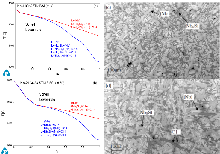 Figure 1.8: Calculated solidification paths with experimental observation (a) and (c) for alloy Nb-11Cr-23Ti-13Si; (b) and (d) for alloy Nb-21Cr-23.5Ti-15.5Si