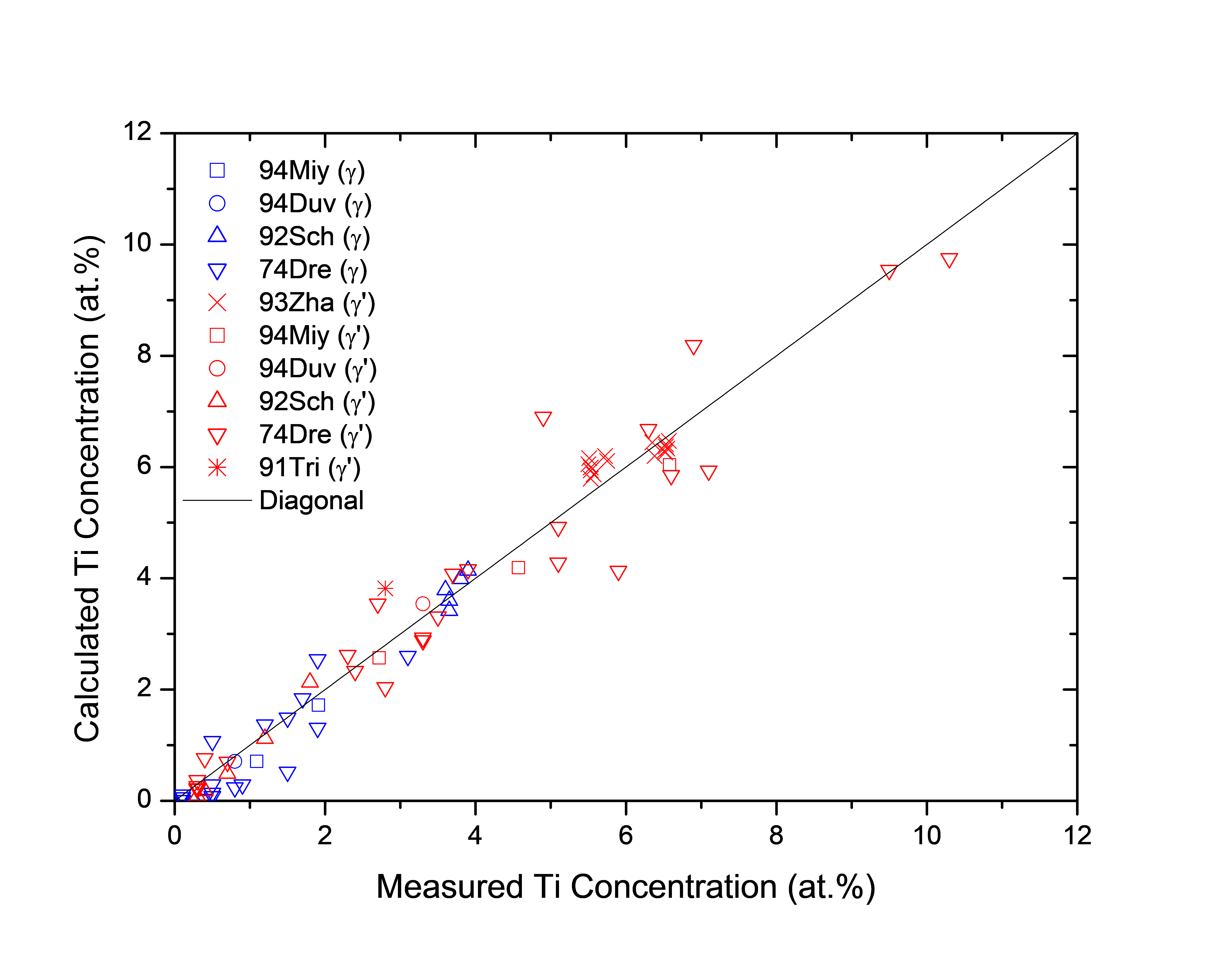 Figure 1.9: Comparison between the calculated and experimentally measured equilibrium compositions of Ti in γ and γ' phases