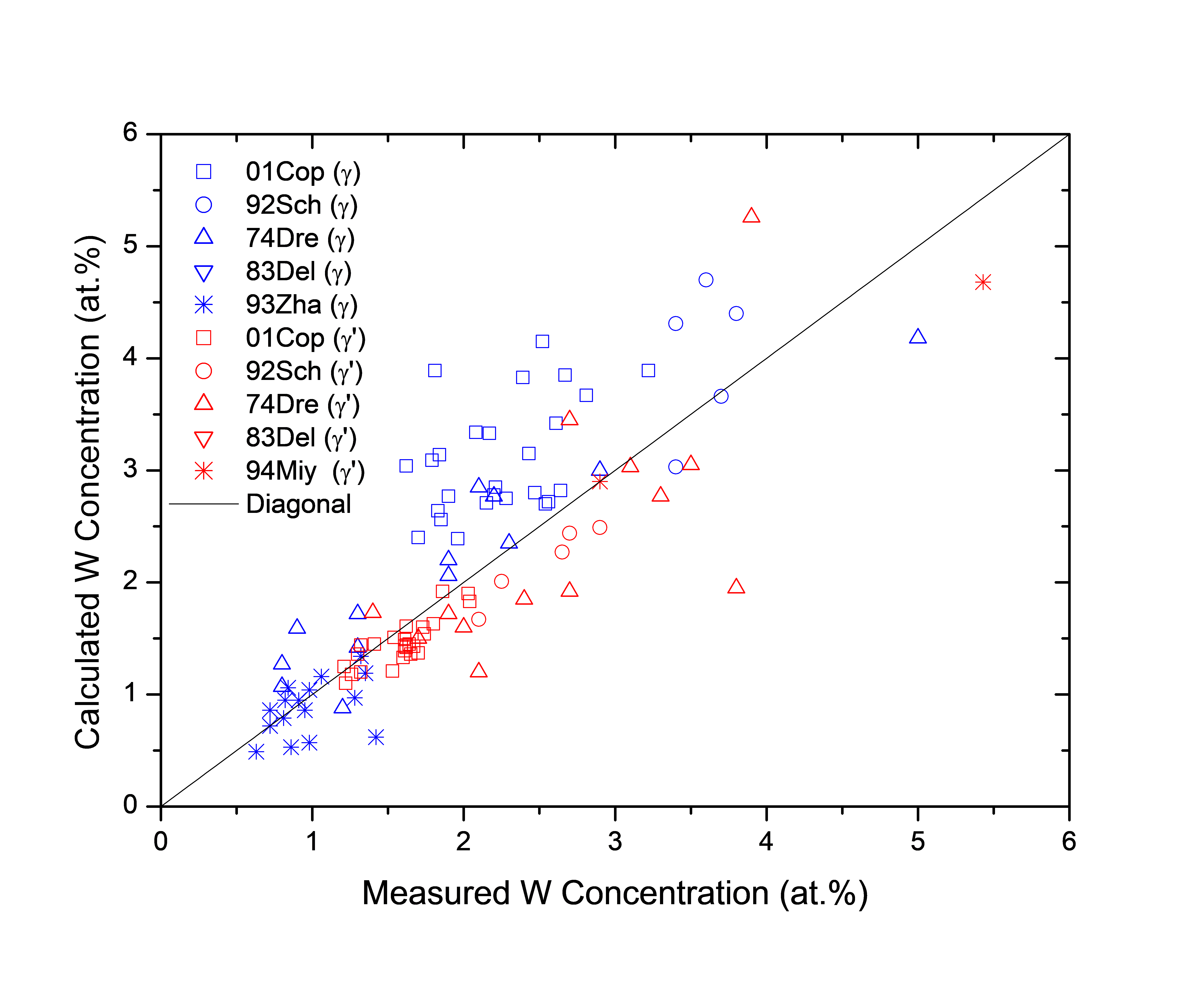 Figure 1.10: Comparison between the calculated and experimentally measured equilibrium compositions of W in γ and γ' phases