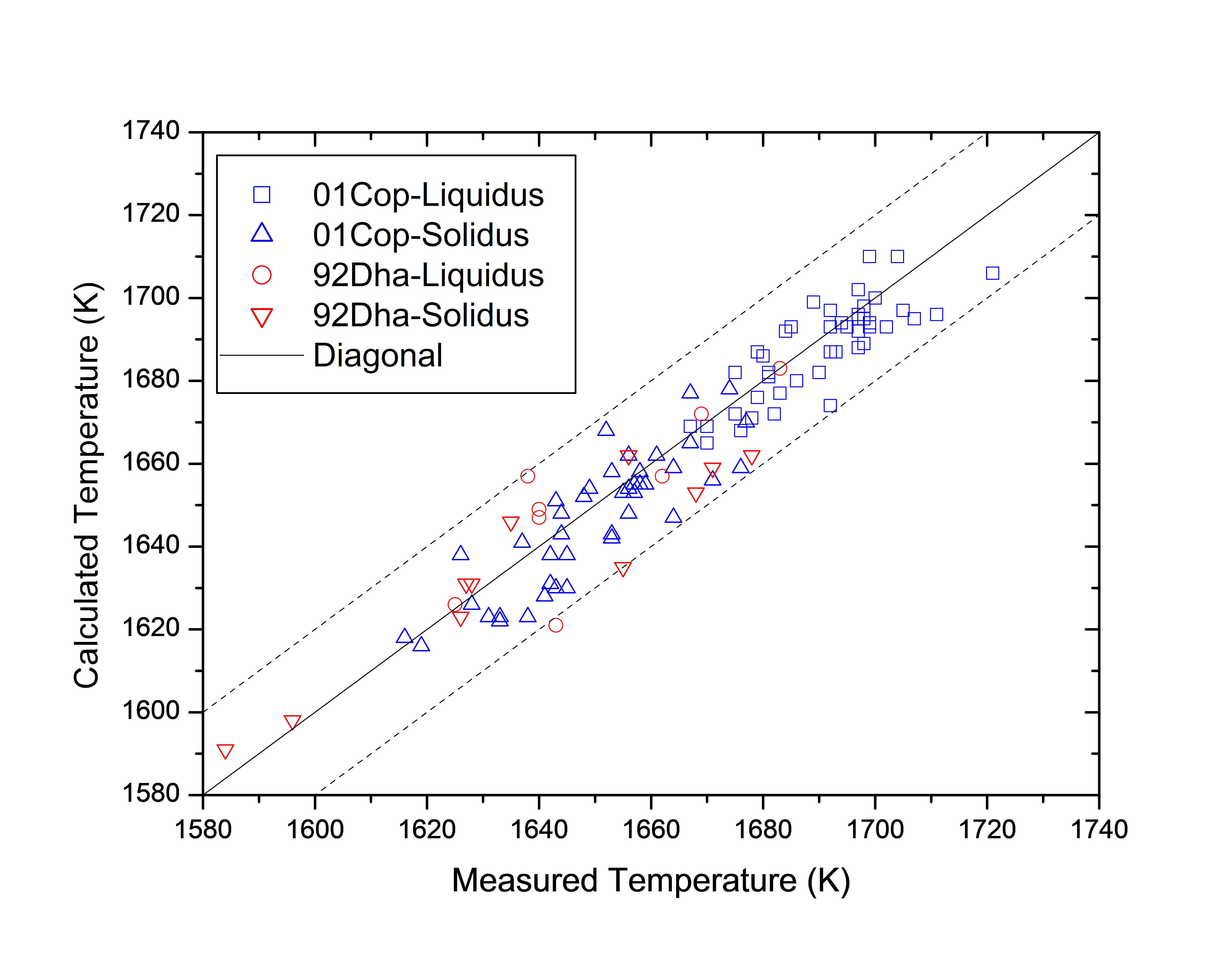 Figure 1.1: Comparison between the calculated and experimentally measured liquidus and solidus temperatures