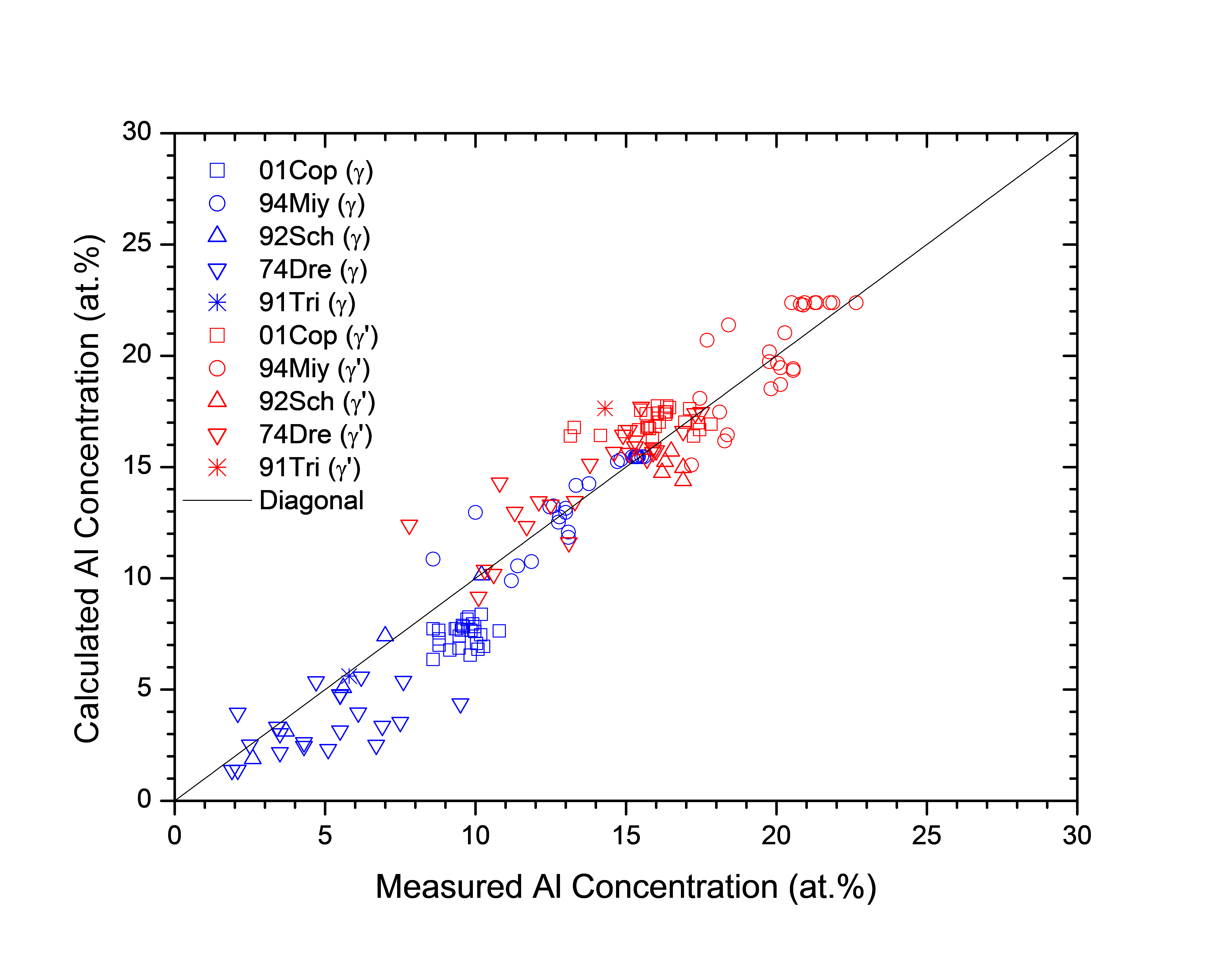 Figure 1.4: Comparison between the calculated and experimentally measured equilibrium compositions of Al in γ and γ' phase