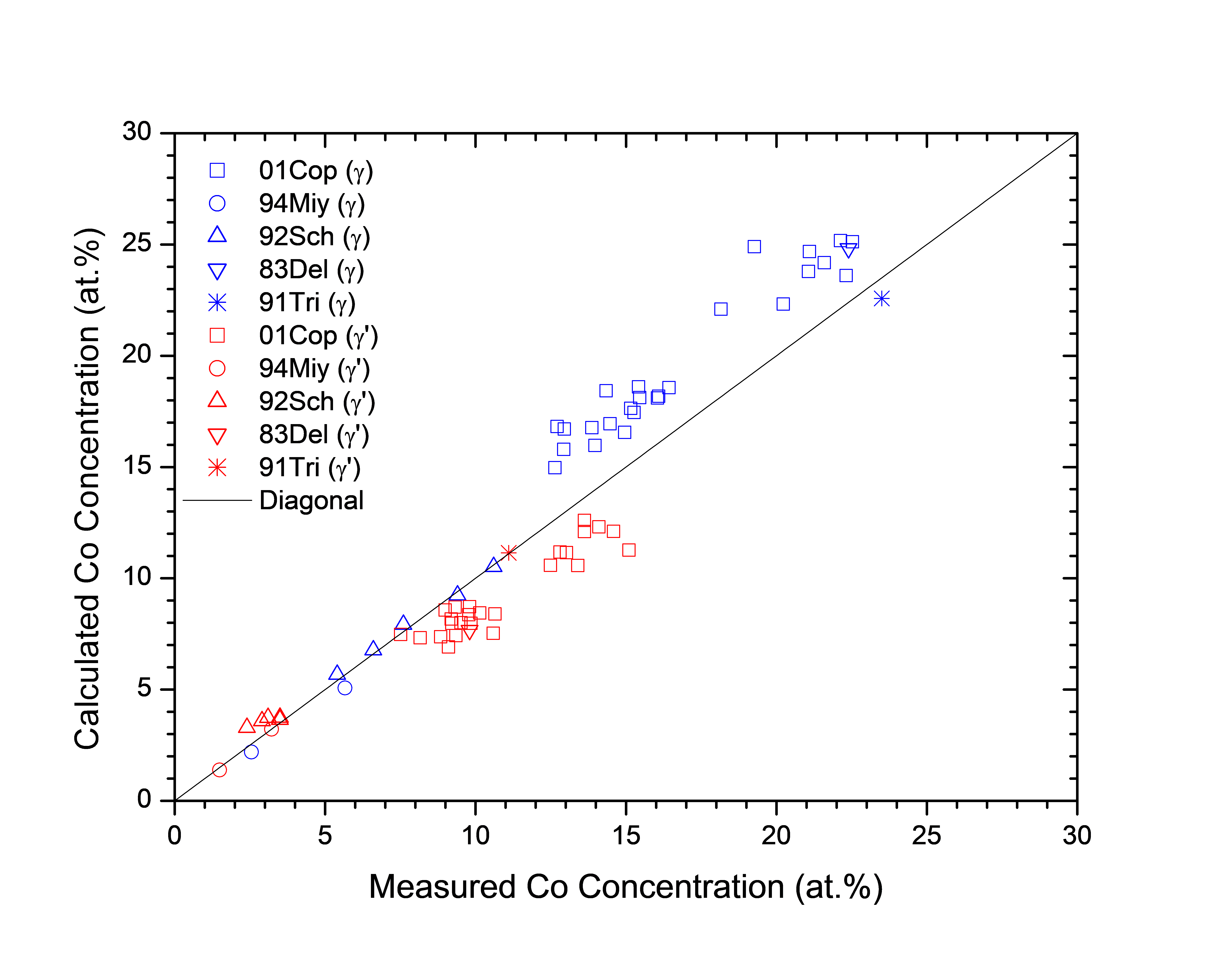 Figure 1.5: Comparison between the calculated and experimentally measured equilibrium compositions of Co in γ and γ' phases