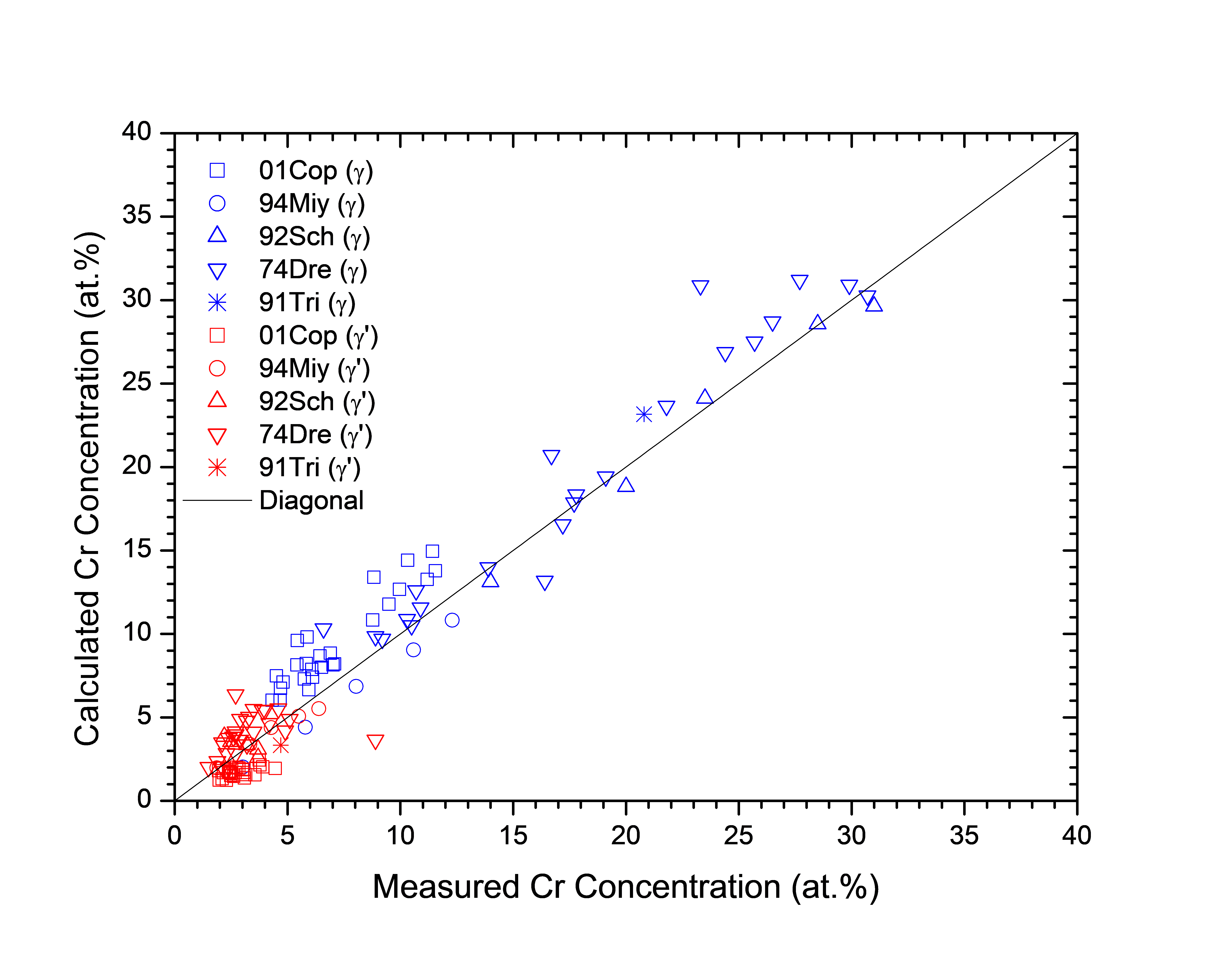 Figure 1.6: Comparison between the calculated and experimentally measured equilibrium compositions of Cr in γ and γ' phases