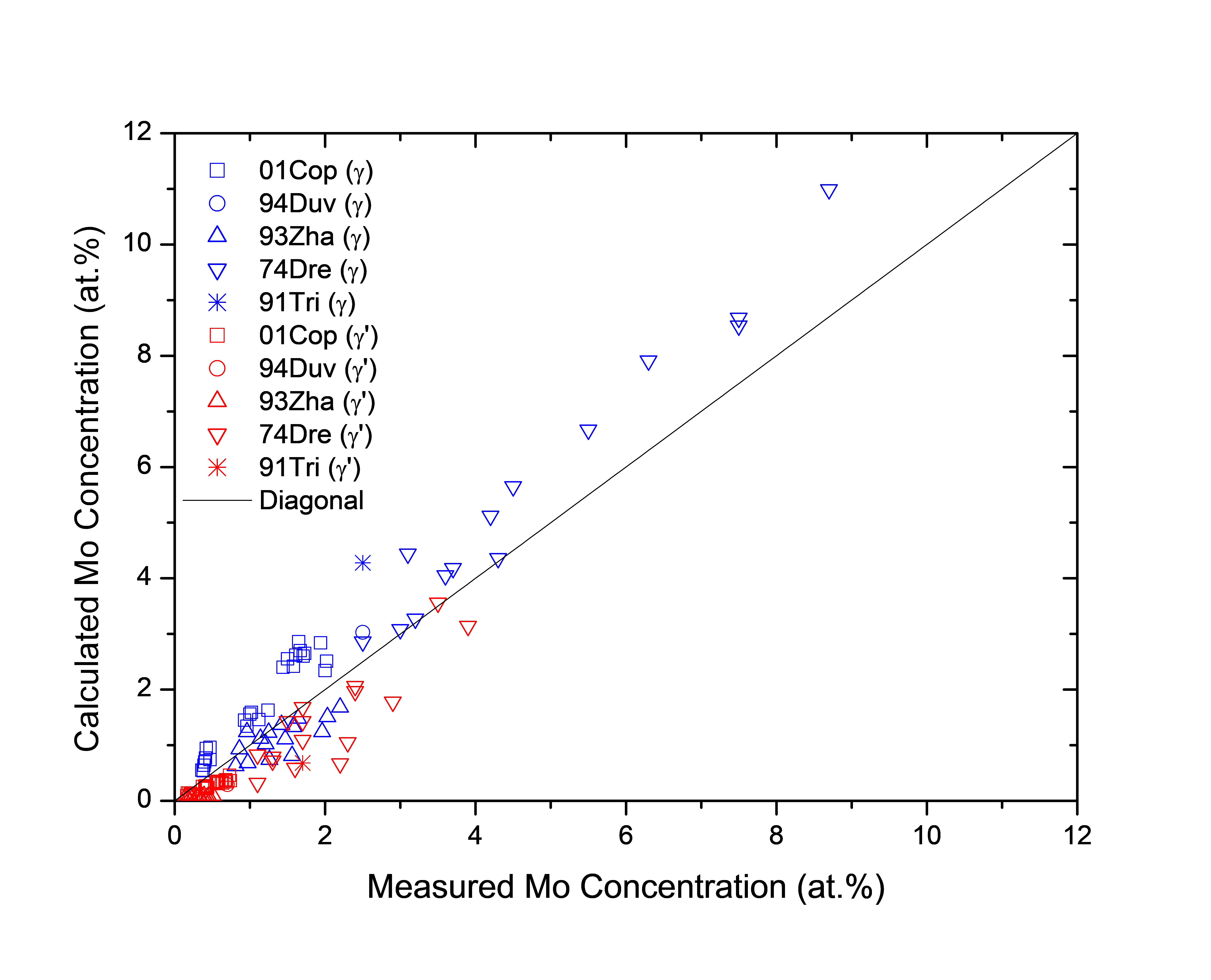 Figure 1.7: Comparison between the calculated and experimentally measured equilibrium compositions of Mo in γ and γ' phases
