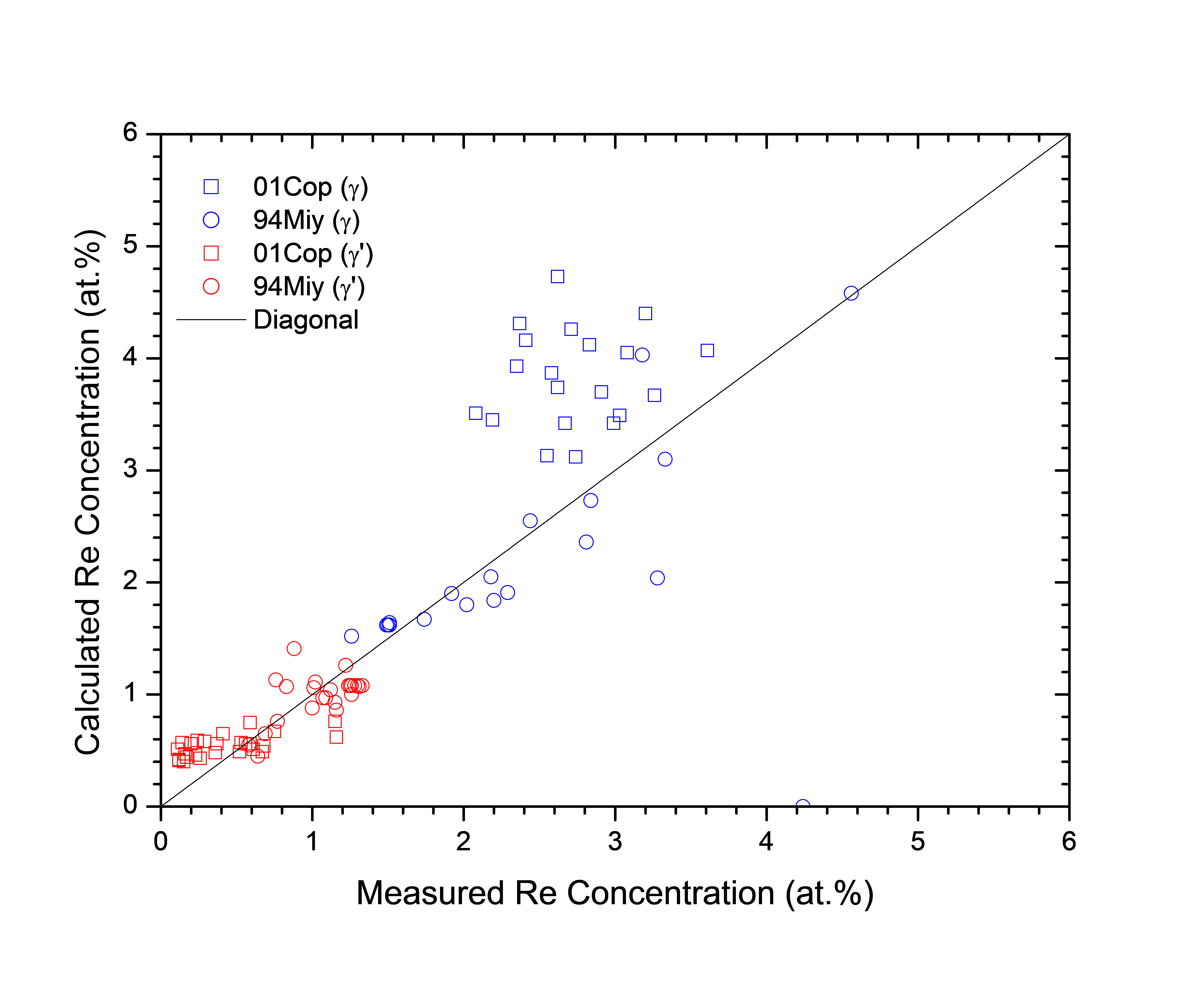 Figure 1.8: Comparison between the calculated and experimentally measured equilibrium compositions of Re in γ and γ' phases
