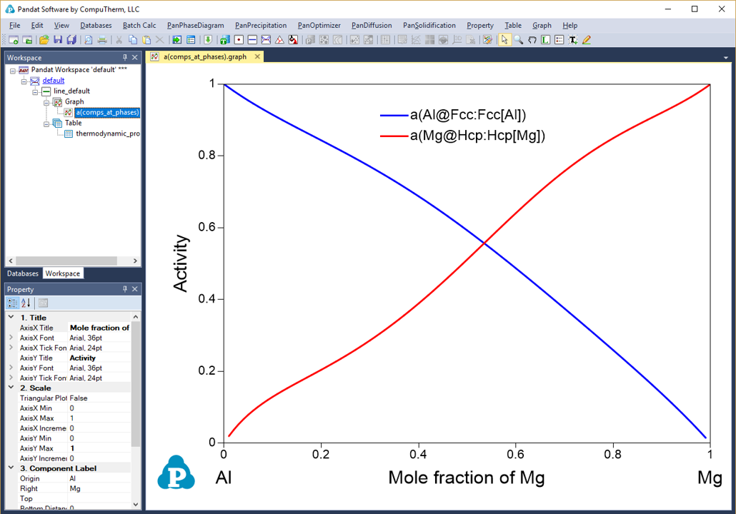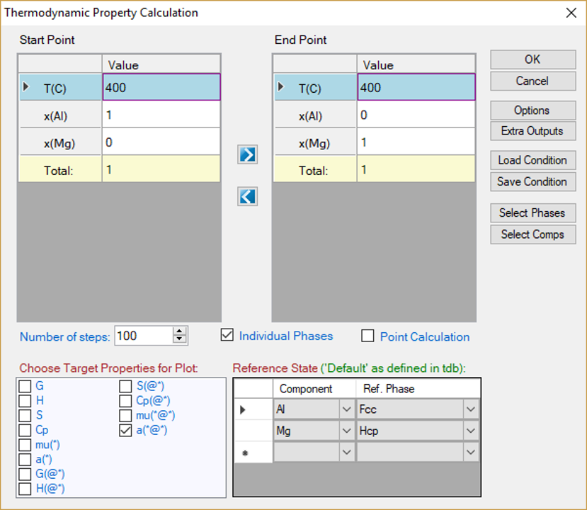 The Thermodynamic Property function is used to calculate thermodynamic properties, such as Gibbs energy, enthalpy, entropy, chemical potential, activity, etc. It is under the PanPhaseDiagram module. User can access this function through the menu (“Property → Thermodynamic Property”) after the thermodynamic database is loaded. A popup window will allow user to input calculation conditions as shown in Figure 9.1