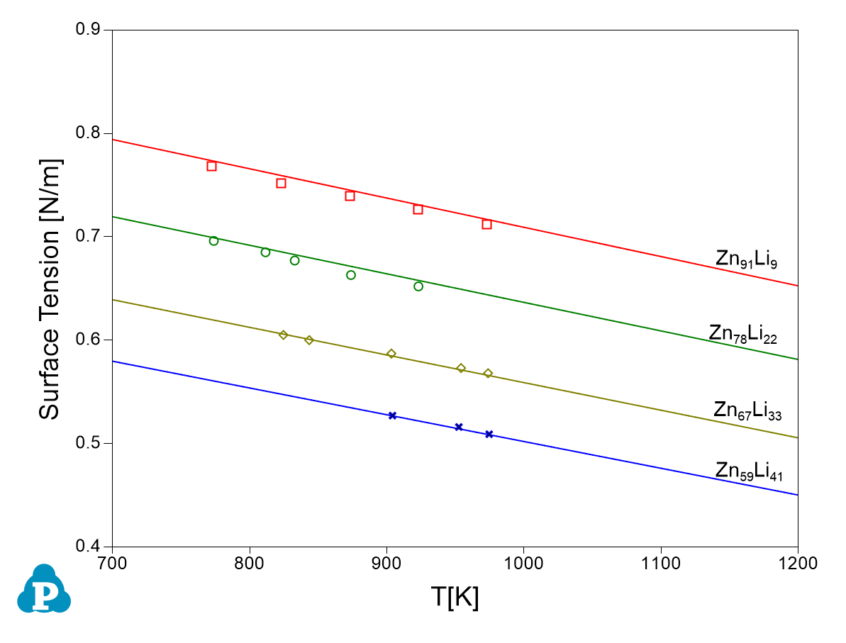The surface tension of the liquid phase is included in the property database. Figure 3.3 shows the surface tension of a series of Zn-Li alloys in comparison with experimental data.