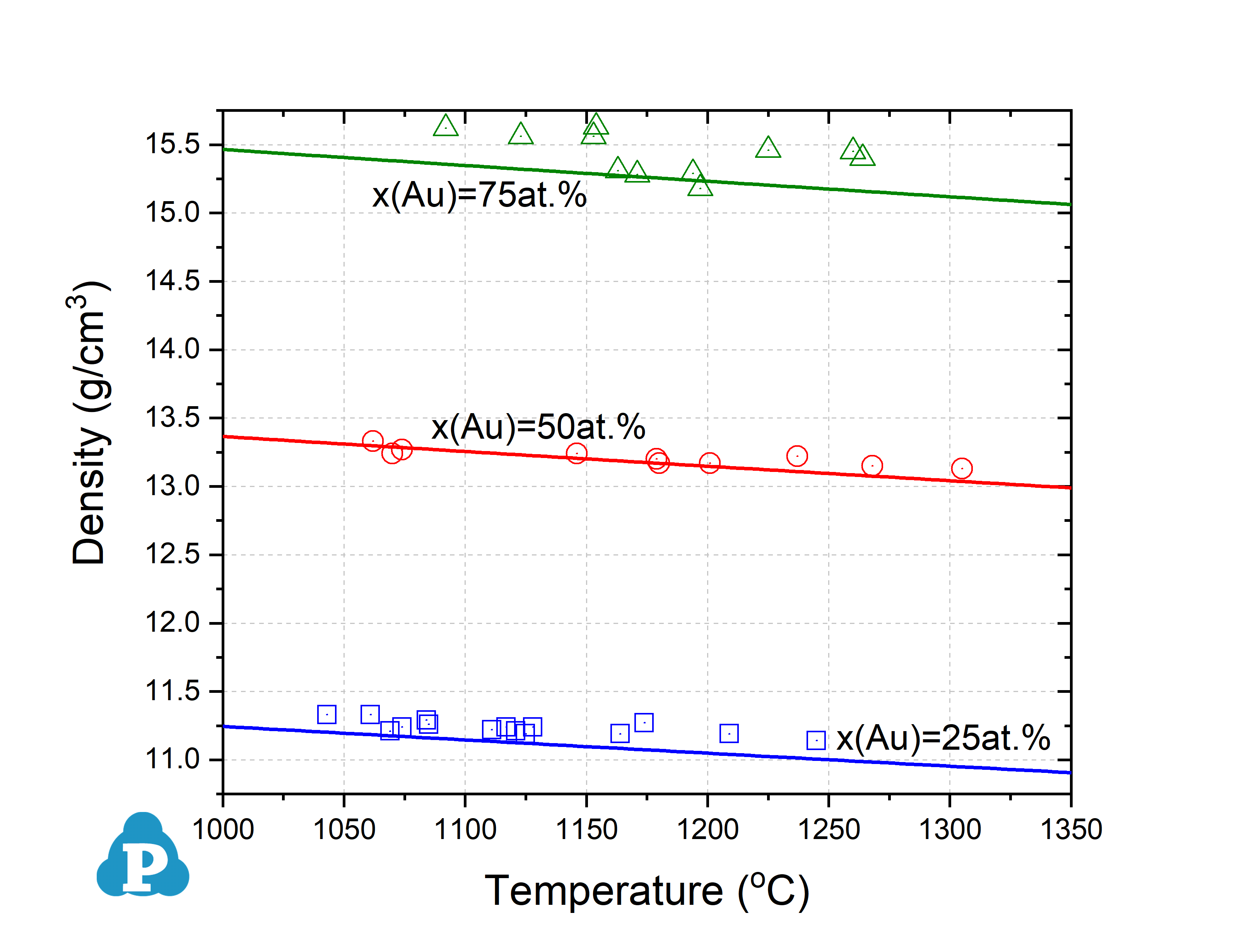 The simulated density changes vs. temperature of a series of noble metal alloys are shown below to validate the current PanNoble_MV database.