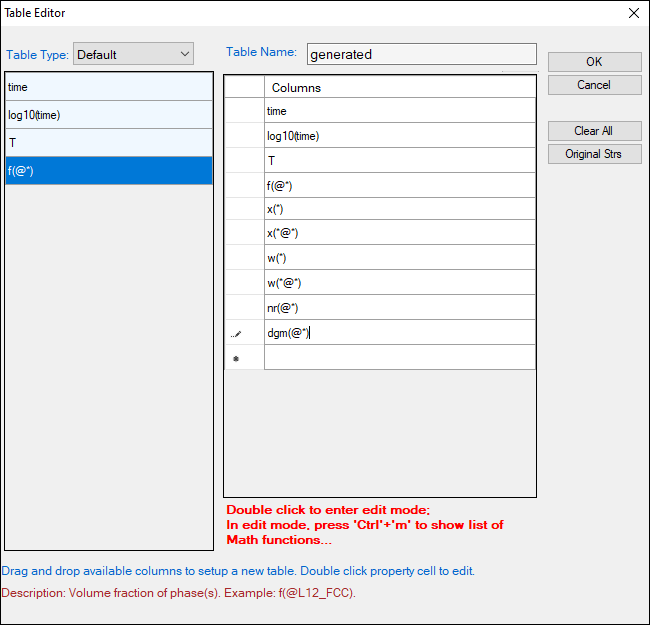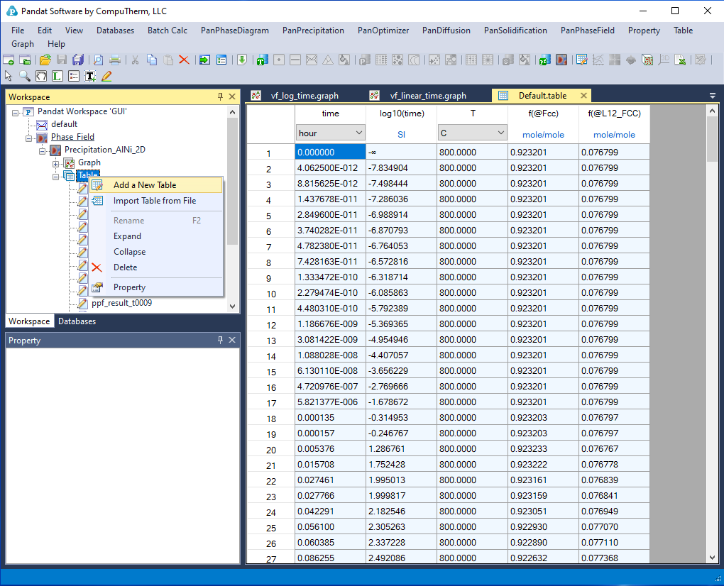 However, it should be emphasized that, in addition to the default tables, variety of properties, such as temperature, nucleation driving force, nucleation rate, average composition of matrix phase can be retrieved through “Add a new table”.