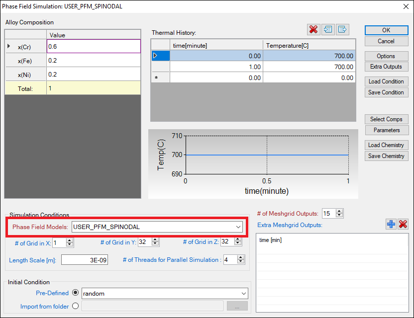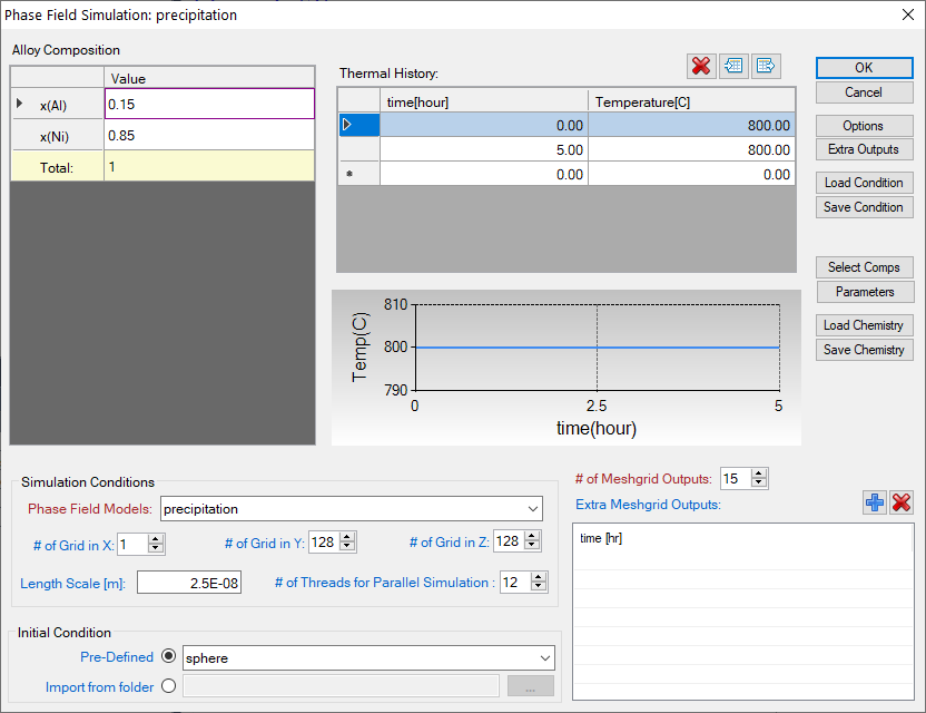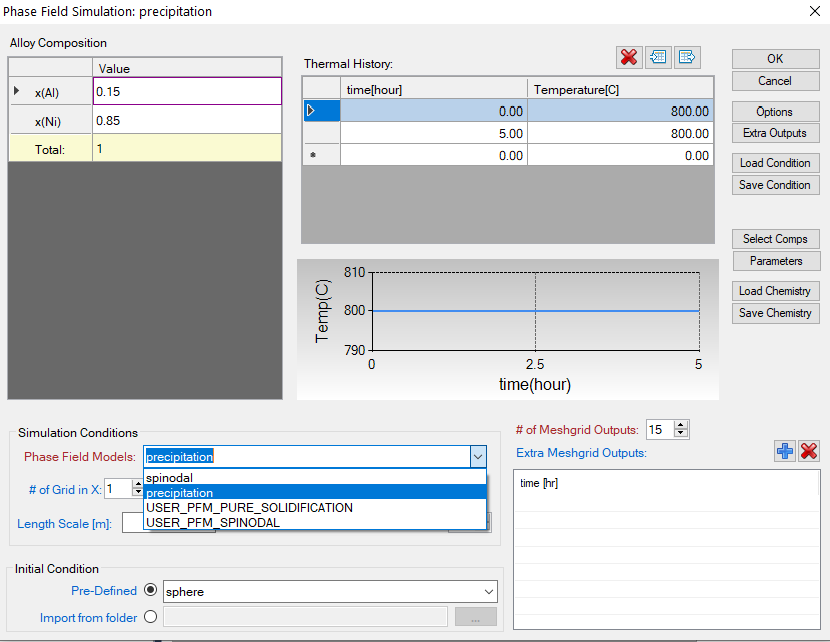 - Initial condition: phase field simulation must be initialized with a pre-existing microstructure without explicitly defining nucleation mechanism by a model. There are three Pre-Defined initial conditions: random, sphere, and empty. Random is used for spinodal decomposition simulation to apply randomized initial composition profile. Sphere is used for precipitation simulation applying a sphere particle with radius of 5 grids at the center of simulation box. Empty is used for simulation without explicitly initialize microstructure, for example, a nucleation simulation.