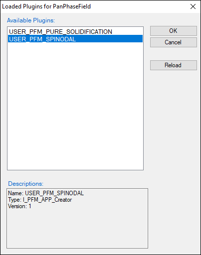 - Phase Field Model: Select a built-in application or a user defined plugin. In Figure 8.7 , “spinodal” and “precipitation” are built-in applications, at the same time user defined customized applications (plugins) are named “USER_PFM_XXX”.