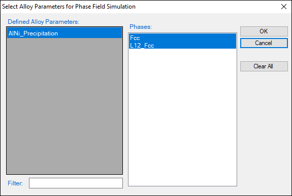 from the toolbar. After AlNi.pfdb is chosen, a dialog box pops out automatically for user to select alloy and phases as shown in Figure 8.5 To select several phases at one time, for example in precipitation simulation where at least two phases should be selected, press and hold the <Ctrl> key.