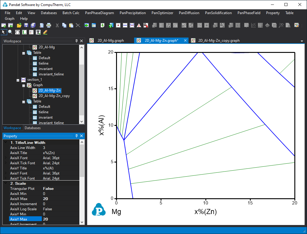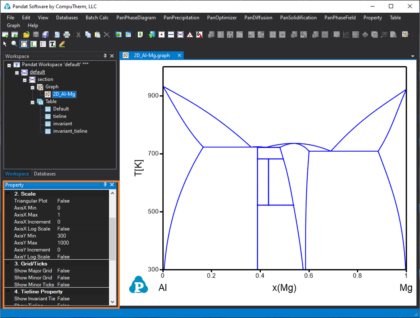 In Pandat, the diagrams are plotted from the table data in the workspace, and the data of the diagrams can be obtained through the corresponding table (how to plot a diagram from table data is described in detail on the Table Operation in Pandat page. Here, we will demonstrate how to zoom and rescale to see some parts of the diagram in more detail.
