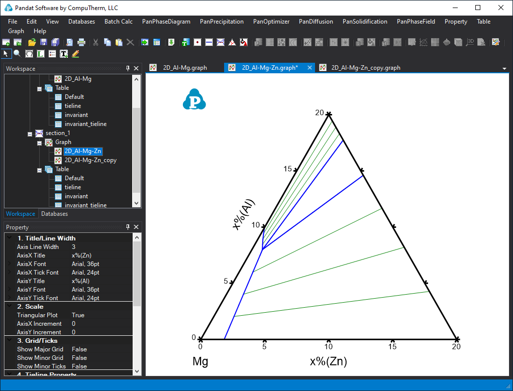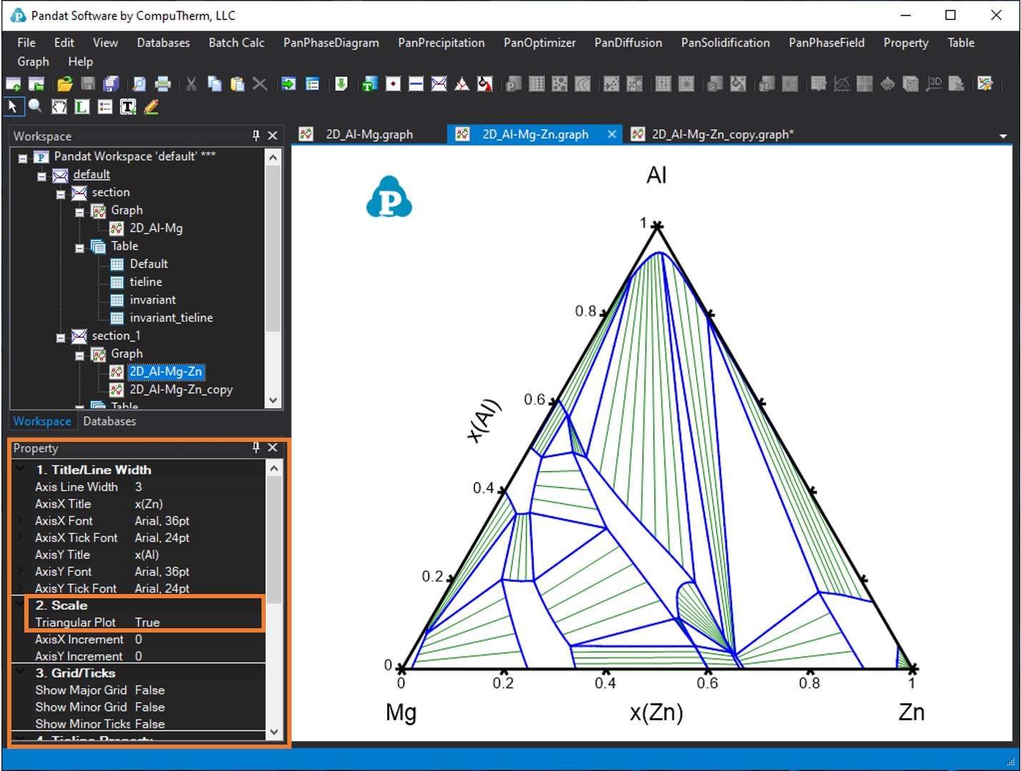 In Pandat, the ternary isotherm sections and liquidus projections are plotted as Gibbs triangle diagrams by default. The default scale is from 0 to 1 (or 0 to 100%). In those diagrams, the “Triangular Plot” is “True” (Figure 2). When the Triangular plot is true, there is no option like “Axis X min”, which means you can not change the axis scale in the triangular manner.