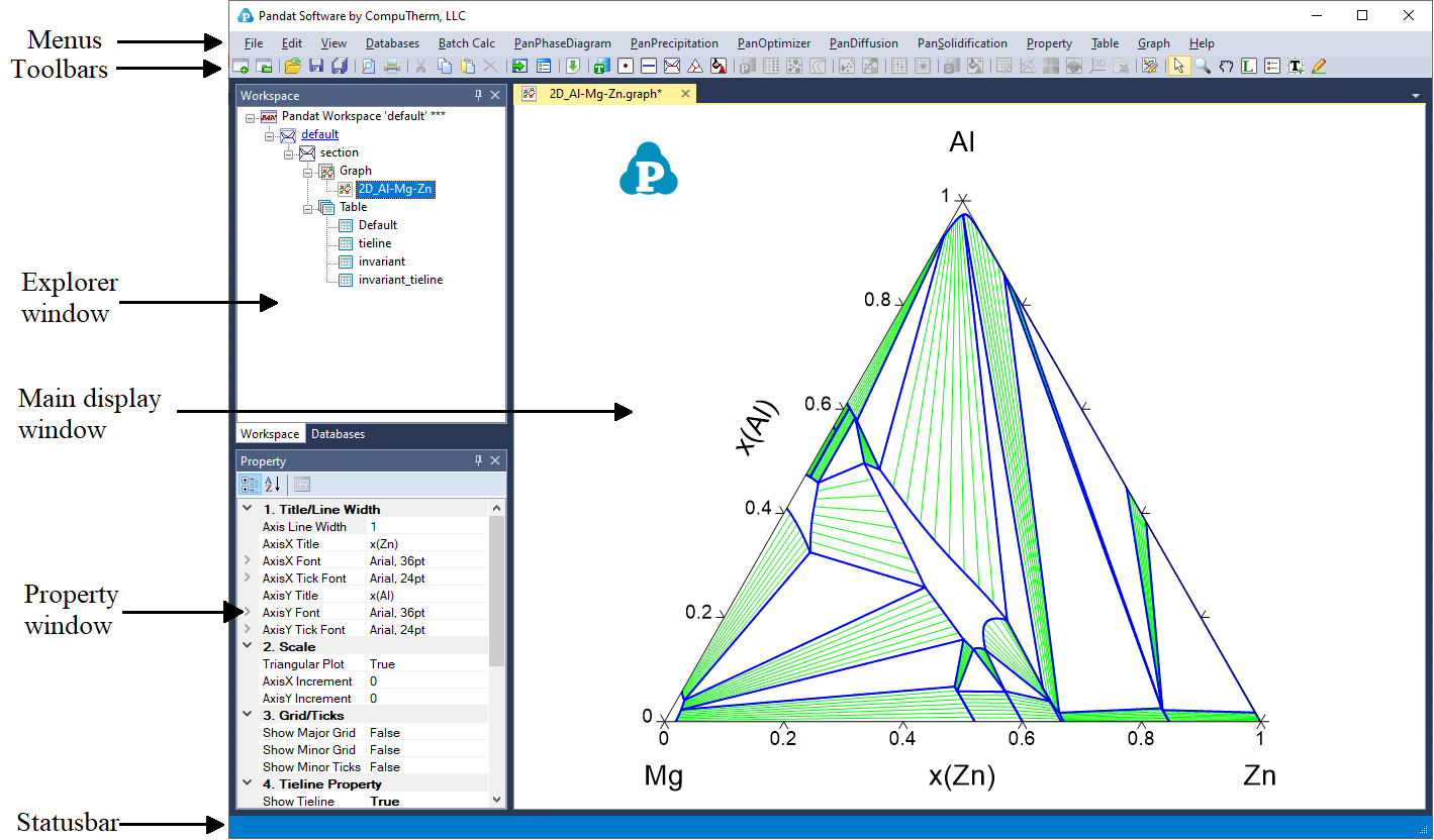 Figure 1 shows the six components of the PanGUI (user interface of the Pandat workspace):Menus, Toolbar, Statusbar , Explorer Window , Property window and Main Display Window.