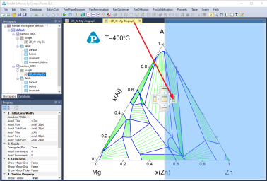 The property window is located below the explorer window. In Pandat, object selection is carried out by single click. Based on the selected object, the properties of the plotted lines, text, graphs and tables will be shown and can be edited in this property window.