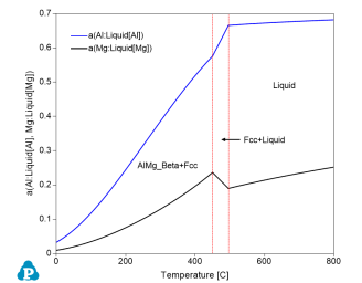 Figure 1 is the Al-Mg binary phase diagram. In this example, we learn to calculate the activity of Al and Mg as a function of temperature at a fixed composition (the red dash line).