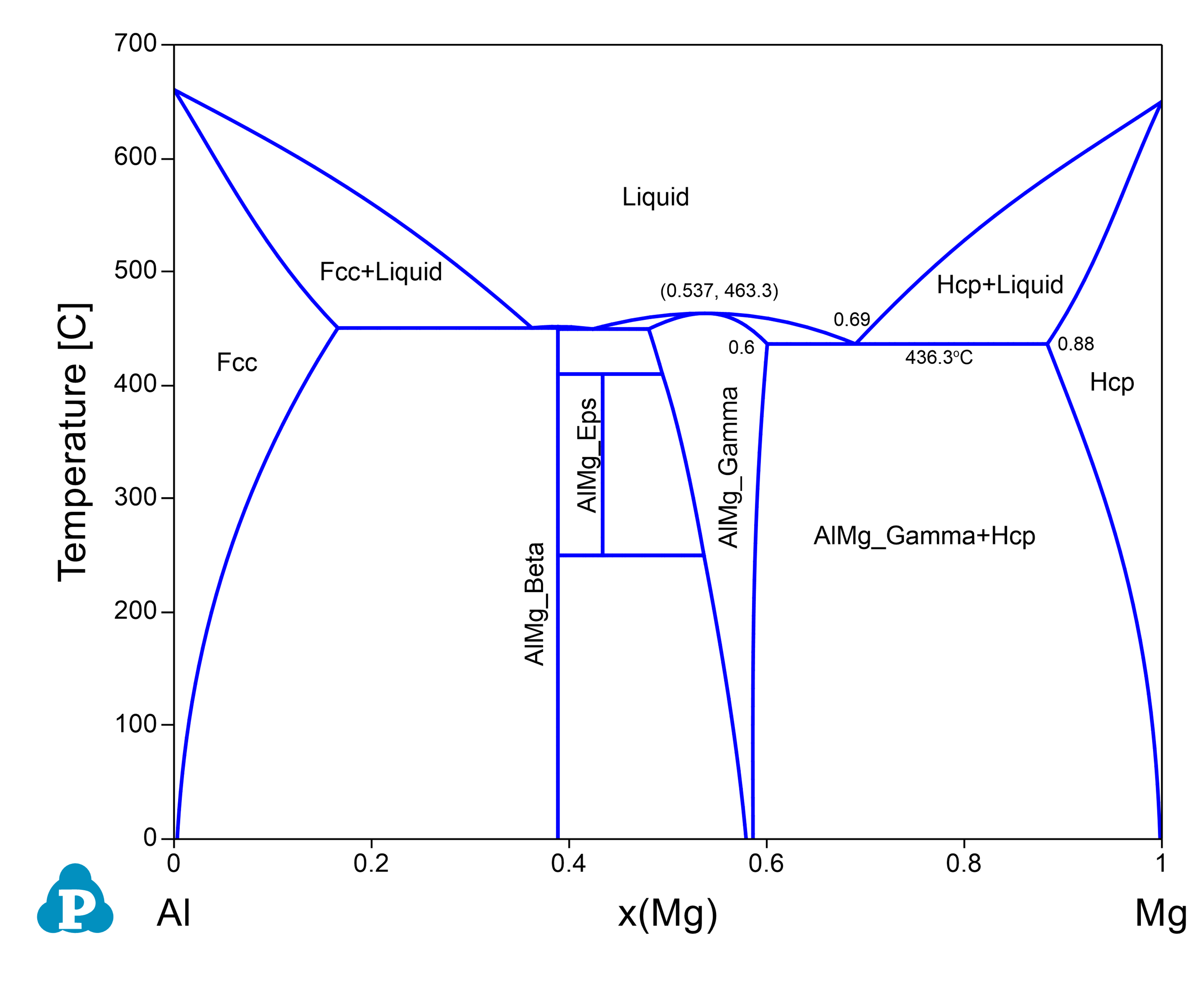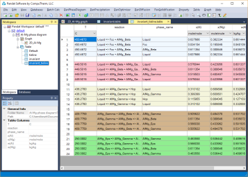 Invariant reaction temperatures and phase compositions. For example the three phase equilibrium: Liquid->AlMg_Gamma+Hcp is at 436.3°C, the composition, x(Mg), of each phase at equilibrium is indicated in Figure 2. Details on the invariant reactions can be found in the “invariant” table as shown in Figure 1, and composition of each phase involved in the invariant reaction can be found in the “invariant_tieline” tables as shown in Figure 4.