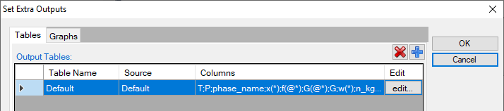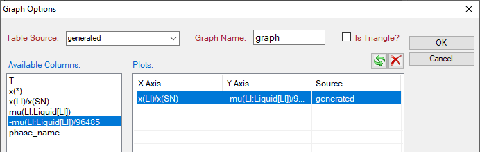 Set “Extra Outputs graph”: Click the icon “Graph” in “Set extra output” interface as shown in Figure 4, then click the blue “+” symbol to add extra Graph. An interface as shown in Figure 5 will appear. Select the “generated” table set in previous step in the “Table source”. Drag x(Li)/x(Sn) from the left column to X axis in the right column; drag -mu(Li:Liquid[Li])/96485 from the left column to Y axis in the right column. Then click OK;