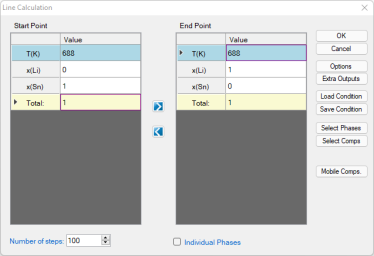 Set the calculation conditions as shown in Figure 1. The temperature is set as 688 K, as experimental data are available at 688 K for comparison. The composition range is from pure Sn, i.e. x(Sn) = 1, to pure Li, i.e. x(Li) = 1. The Number of steps is set to be 100;