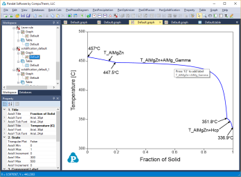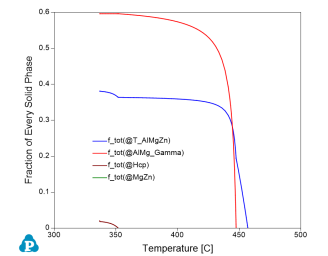 The primary solidified phase is T_AlMgZn phase, AlMg_Gamma starts to solidify at 447.5°C and Hcp starts to solidify at 351.8°C. Put the cursor on the line segment, a tool tip will pop out showing the phase(s) solidified in that composition and temperature range (Figure 2). Press ‘F2’ to label it;