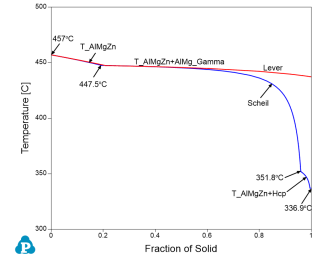 Figure 2 shows the fraction of solid as a function of temperature from Scheil simulation. Solidification starts at 457°C and ends at 336.9°C, the freezing range is 120.1°C;